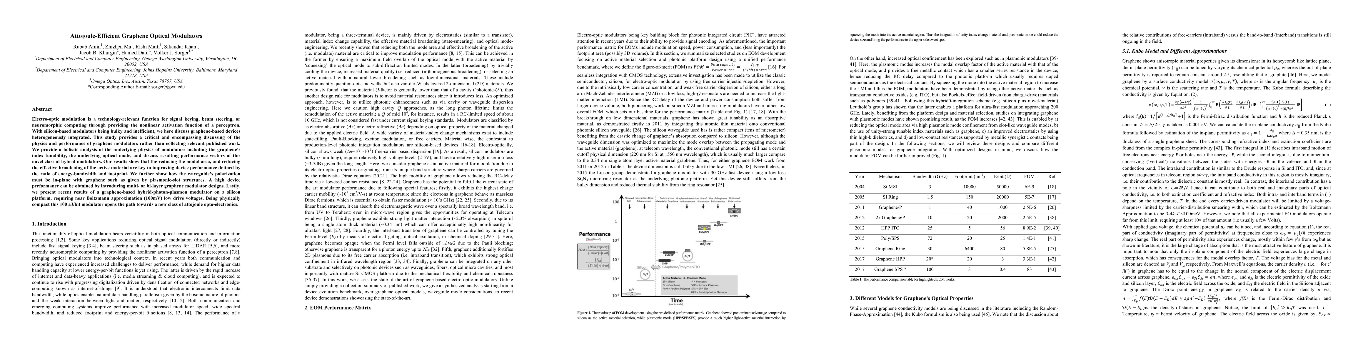 Electro-optic modulation is a technology-relevant function for signal keying, beam steering, or neuromorphic computing through providing the nonlinear activation function of a perceptron. With silicon-based modulators being bulky and inefficient, we here discuss graphene-based devices heterogeneously integrated. This study provides a critical and encompassing discussing of the physics and performance of graphene modulators rather than collecting relevant published work. We provide a holistic analysis of the underlying physics of modulators including the graphenes index tunability, the underlying optical mode, and discuss resulting performance vectors of this novel class of hybrid modulators. Our results show that the reducing the modal area, and reducing the effective broadening of the active material are key to improving device performance defined by the ratio of energy-bandwidth and footprint. We further show how the waveguides polarization must be in-plane with graphene such as given by plasmonic-slot structures. A high device performance can be obtained by introducing multi- or bi-layer graphene modulator designs. Lastly, we present recent results of a graphene-based hybrid-photon-plasmon modulator on a silicon platform, requiring near Boltzmann approximation (100mV) low drive voltages. Being physically compact this 100 aJ/bit modulator opens the path towards a new class of attojoule opto-electronics.