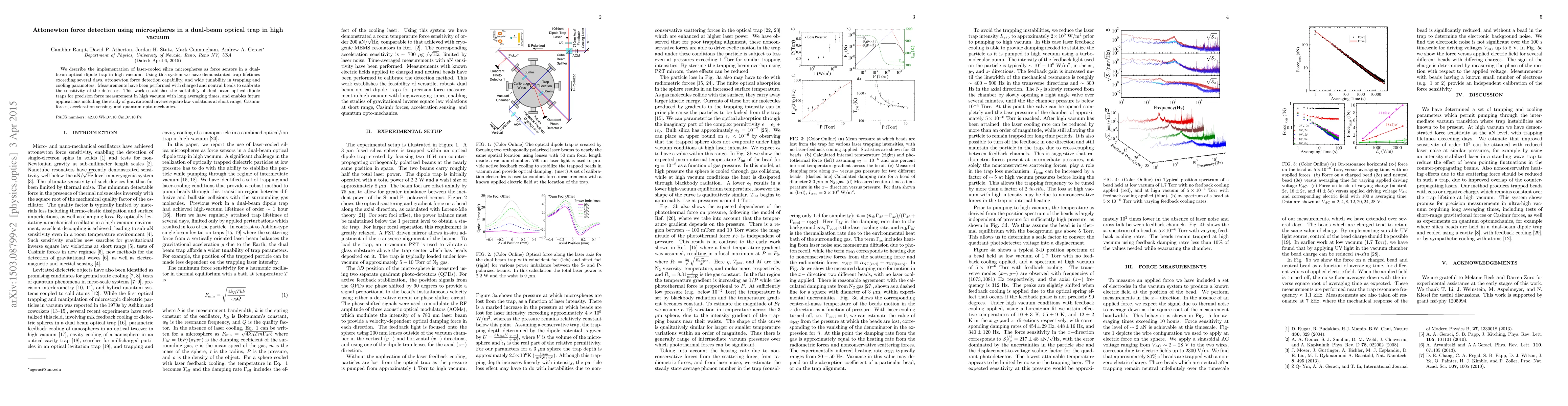 This research implements laser-cooled silica microspheres in a dual-beam optical trap for attonewton force detection in high vacuum, achieving long trap lifetimes and wide tunability. The method's precision paves the way for advanced studies in gravitational, Casimir forces, and quantum opto-mechanics.
