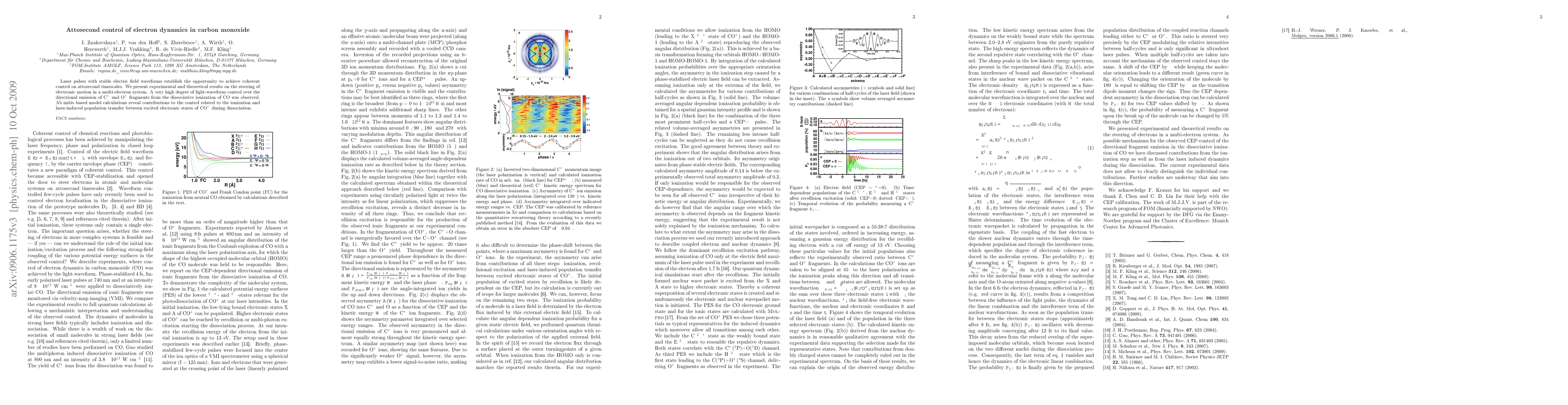This paper demonstrates the use of stable laser pulses to control the attosecond dynamics of electrons in carbon monoxide, achieving precise directional emission of C+ and O+ fragments. Theoretical insights show that ionization and laser-induced transitions between excited states of CO+ play a key role in this control.
