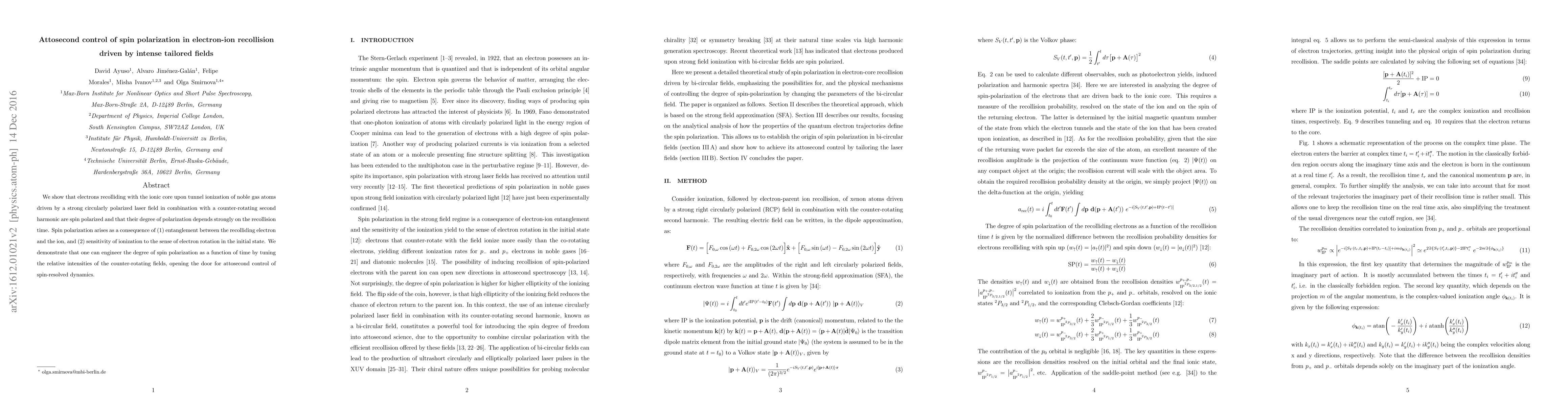 This paper demonstrates that spin polarization of electrons recolliding with ions after tunnel ionization in noble gas atoms can be controlled attosecond-precisely by tailoring the intensities of circularly polarized laser fields and their counter-rotating second harmonics. The degree of polarization depends on recollision timing, revealing entanglement and ionization sensitivity to electron rotation.
