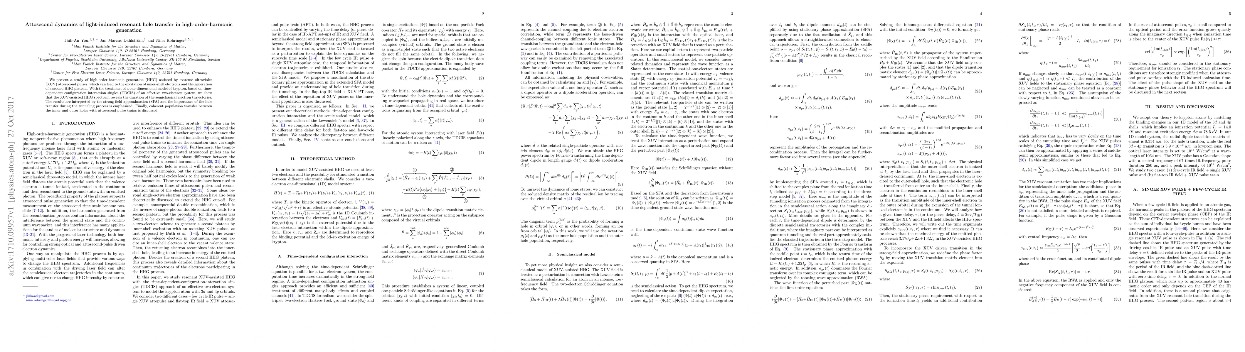 We present a study of high-order-harmonic generation (HHG) assisted by extreme ultraviolet (XUV) attosecond pulses, which can lead to the excitation of inner-shell electrons and the generation of a second HHG plateau. With the treatment of a one-dimensional model of krypton, based on time-dependent configuration interaction singles (TDCIS) of an effective two-electron system, we show that the XUV-assisted HHG spectrum reveals the duration of the semiclassical electron trajectories. The results are interpreted by the strong-field approximation (SFA) and the importance of the hole transfer during the tunneling process is emphasized. Finally, coherent population transfer between the inner and outer holes with attosecond pulse trains is discussed.