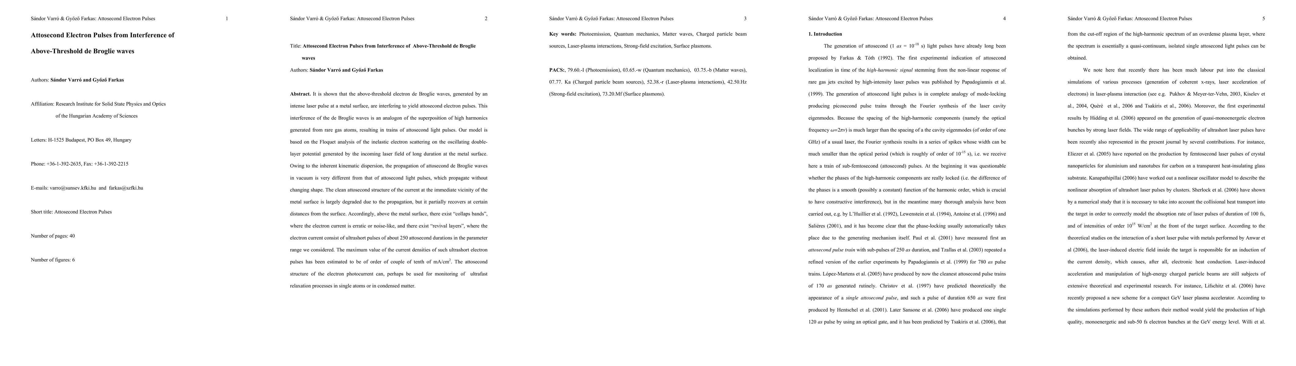 This paper demonstrates that intense laser pulses can generate attosecond electron pulses through the interference of above-threshold de Broglie waves at a metal surface. These pulses exhibit unique propagation characteristics compared to light pulses, including "collaps bands" and "revival layers" of electron current at macroscopic distances.