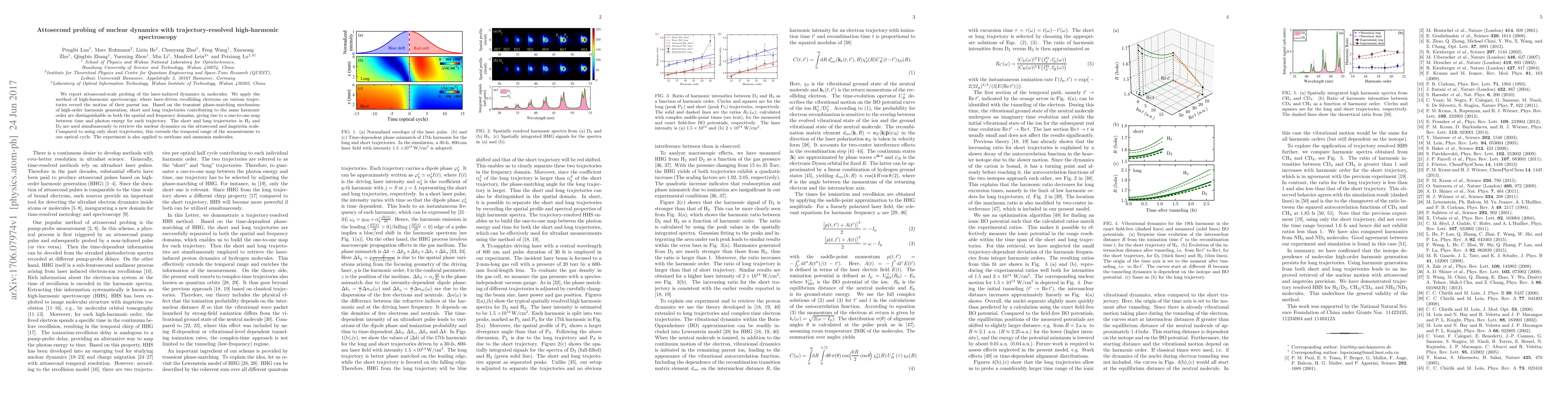 This paper reports on the use of high-harmonic spectroscopy to probe laser-induced nuclear dynamics in molecules at attosecond resolution, distinguishing short and long electron trajectories to extend the temporal range of measurements to one optical cycle. The method is applied to H2, D2, methane, and ammonia molecules.