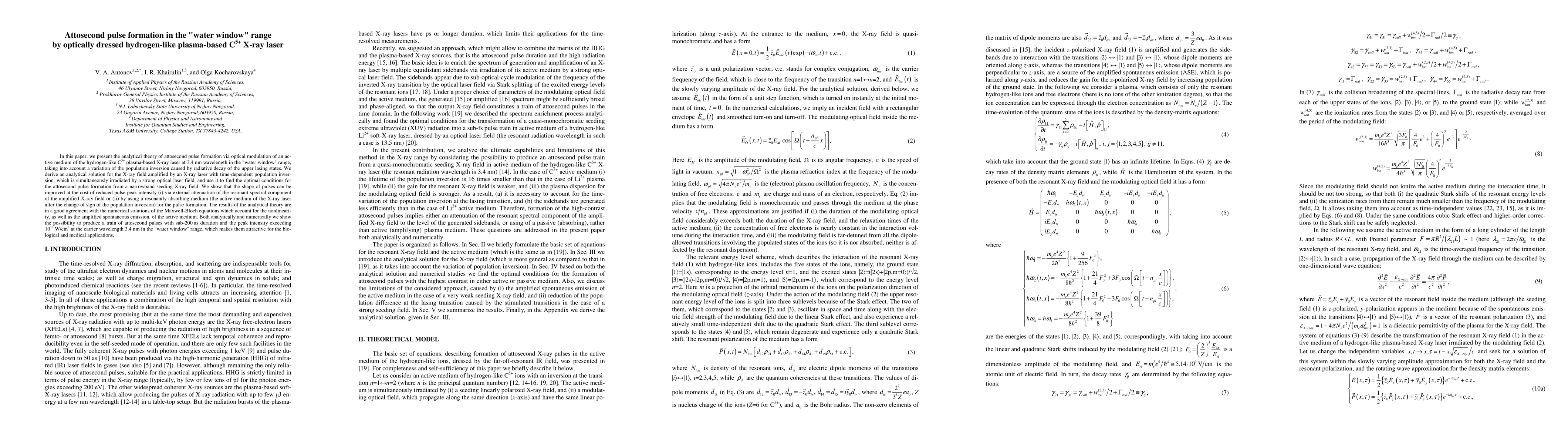 This paper presents an analytical theory for the formation of attosecond pulses via optical modulation of a hydrogen-like C5+ plasma-based X-ray laser at 3.4 nm. The study finds optimal conditions for generating sub-200 attosecond pulses with peak intensity over 10^12 W/cm^2, offering potential for biological and medical applications.