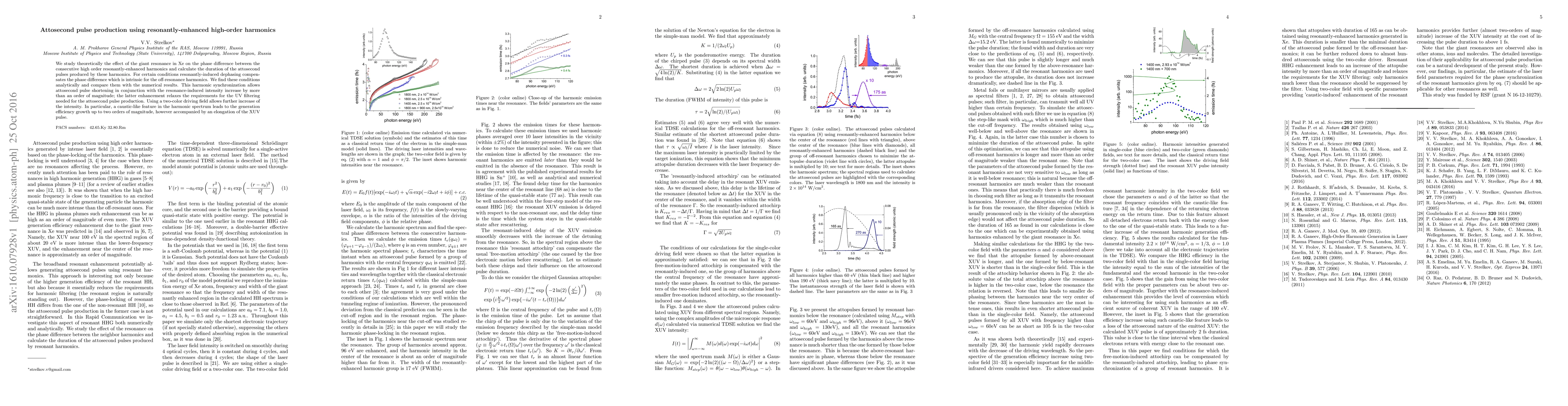 We study theoretically the effect of the giant resonance in Xe on the phase difference between the consecutive high order resonantly-enhanced harmonics and calculate the duration of the attosecond pulses produced by these harmonics. For certain conditions resonantly-induced dephasing compensates the phase difference which is intrinsic for the off-resonance harmonics. We find these conditions analytically and compare them with the numerical results. This harmonic synchronization allows attosecond pulse shortening in conjunction with the resonance-induced intensity increase by more than an order of magnitude; the latter enhancement relaxes the requirements for the UV filtering needed for the attosecond pulse production. Using a two-color driving field allows further increase of the intensity. In particular, a caustic-like feature in the harmonic spectrum leads to the generation efficiency growth up to two orders of magnitude, however accompanied by an elongation of the XUV pulse.