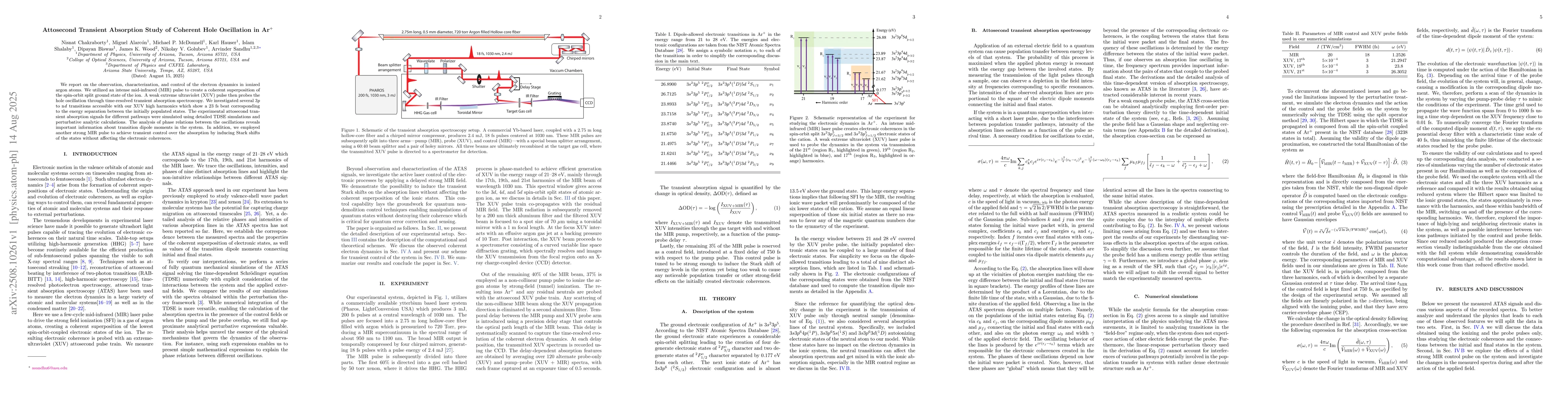 We report on the observation, characterization, and control of the electron dynamics in ionized argon atoms. We utilized an intense mid-infrared (MIR) pulse to create a coherent superposition of the spin-orbit split ground state of the ion. A weak extreme ultraviolet (XUV) pulse then probes the hole oscillation through time-resolved transient absorption spectroscopy. We investigated several 3p to nd transitions accessible with our XUV high harmonics which show a 23fs beat corresponding to the energy separation between the initially populated states. The experimental attosecond transient absorption signals for different pathways were simulated using detailed TDSE simulations and perturbative analytic calculations. The analysis of phase relations between the oscillations reveals important information about transition dipole moments in the system. In addition, we employed another strong MIR pulse to achieve transient control over the absorption by inducing Stark shifts of the states without affecting the electronic coherences.