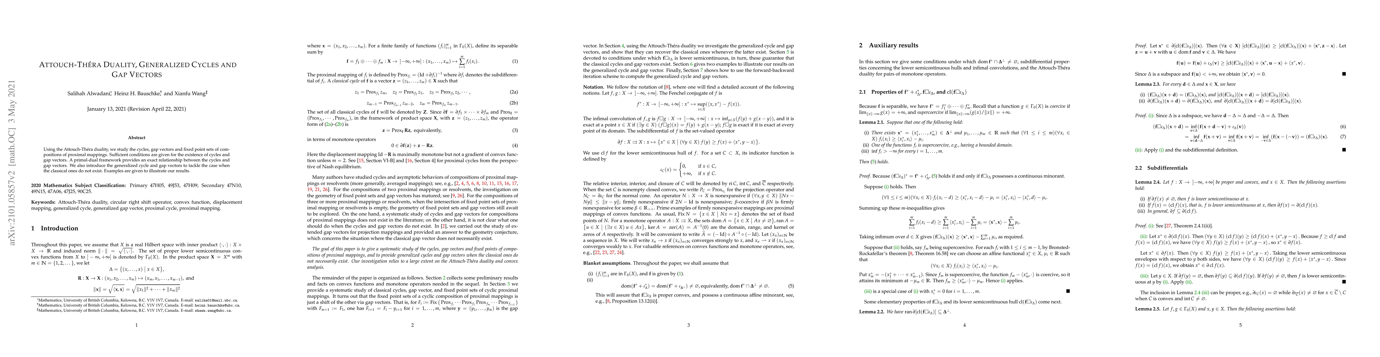 This paper explores the Attouch-Théra duality to investigate cycles, gap vectors, and fixed point sets in compositions of proximal mappings, providing sufficient conditions for their existence and introducing generalized versions when classical ones fail. It establishes a primal-dual framework linking cycles and gap vectors.