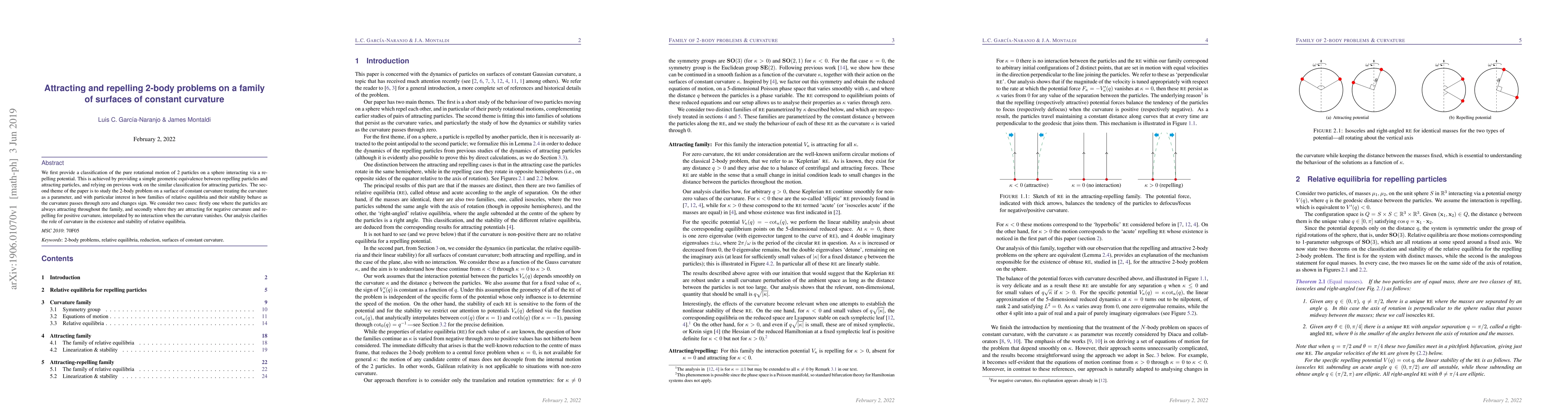 This paper classifies the rotational motion of two repelling particles on a sphere and examines the 2-body problem on surfaces of constant curvature, focusing on how relative equilibria and their stability change as curvature passes through zero and changes sign, revealing the impact of curvature on these dynamics.