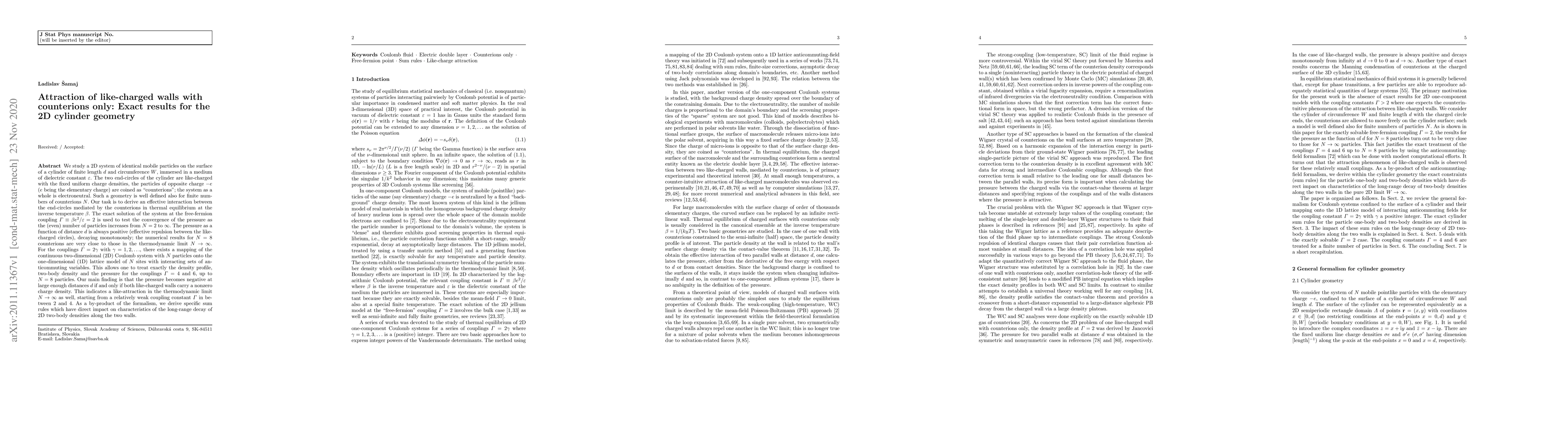 We study a 2D system of identical mobile particles on the surface of a cylinder of finite length $d$ and circumference $W$, immersed in a medium of dielectric constant $\varepsilon$. The two end-circles of the cylinder are like-charged with the fixed uniform charge densities, the particles of opposite charge $-e$ ($e$ being the elementary charge) are coined as ``counterions''; the system as a whole is electroneutral. Such a geometry is well defined also for finite numbers of counterions $N$. Our task is to derive an effective interaction between the end-circles mediated by the counterions in thermal equilibrium at the inverse temperature $\beta$. The exact solution of the system at the free-fermion coupling $\Gamma \equiv \beta e^2/\varepsilon =2$ is used to test the convergence of the pressure as the (even) number of particles increases from $N=2$ to $\infty$. The pressure as a function of distance $d$ is always positive (effective repulsion between the like-charged circles), decaying monotonously; the numerical results for $N=8$ counterions are very close to those in the thermodynamic limit $N\to\infty$. For the couplings $\Gamma=2\gamma$ with $\gamma=1,2,\ldots$, there exists a mapping of the continuous two-dimensional (2D) Coulomb system with $N$ particles onto the one-dimensional (1D) lattice model of $N$ sites with interacting sets of anticommuting variables. This allows one to treat exactly the density profile, two-body density and the pressure for the couplings $\Gamma=4$ and $6$, up to $N=8$ particles. Our main finding is that the pressure becomes negative at large enough distances $d$ if and only if both like-charged walls carry a nonzero charge density. This indicates a like-attraction in the thermodynamic limit $N\to\infty$ as well, starting from a relatively weak coupling constant $\Gamma$ in between 2 and 4.
