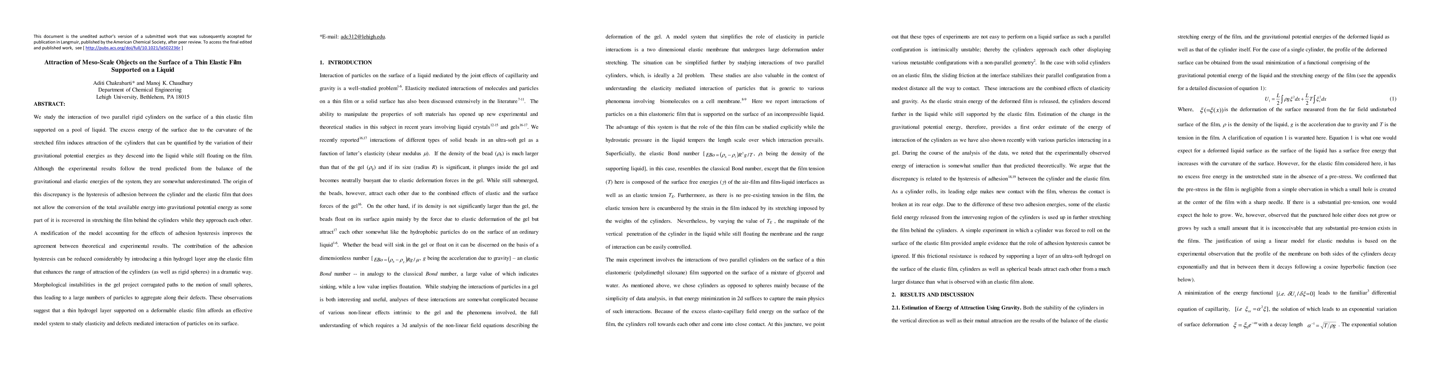 We study the interaction of two parallel rigid cylinders on the surface of a thin elastic film supported on a pool of liquid. The excess energy of the surface due to the curvature of the stretched film induces attraction of the cylinders that can be quantified by the variation of their gravitational potential energies as they descend into the liquid while still floating on the film. Although the experimental results follow the trend predicted from the balance of the gravitational and elastic energies of the system, they are somewhat underestimated. The origin of this discrepancy is the hysteresis of adhesion between the cylinder and the elastic film that does not allow the conversion of the total available energy into gravitational potential energy as some part of it is recovered in stretching the film behind the cylinders while they approach each other. A modification of the model accounting for the effects of adhesion hysteresis improves the agreement between theoretical and experimental results. The contribution of the adhesion hysteresis can be reduced considerably by introducing a thin hydrogel layer atop the elastic film that enhances the range of attraction of the cylinders (as well as rigid spheres) in a dramatic way. Morphological instabilities in the gel project corrugated paths to the motion of small spheres, thus leading to a large numbers of particles to aggregate along their defects. These observations suggest that a thin hydrogel layer supported on a deformable elastic film affords an effective model system to study elasticity and defects mediated interaction of particles on its surface.