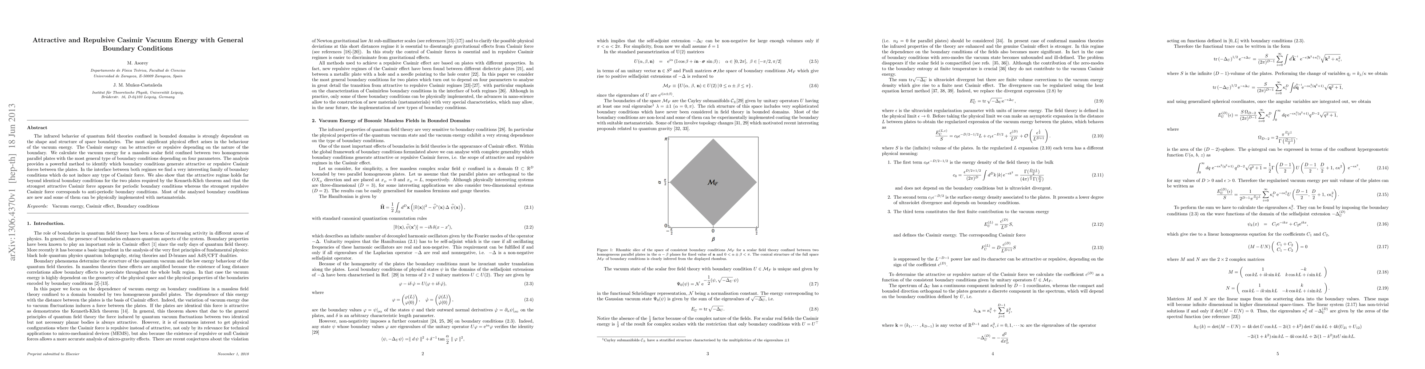 This paper investigates the Casimir vacuum energy between two parallel plates under general boundary conditions, revealing that the energy can be either attractive or repulsive depending on the boundary nature. It identifies specific boundary conditions that generate these forces and finds a unique set that induces no Casimir force, extending the attractive regime beyond identical boundary conditions.