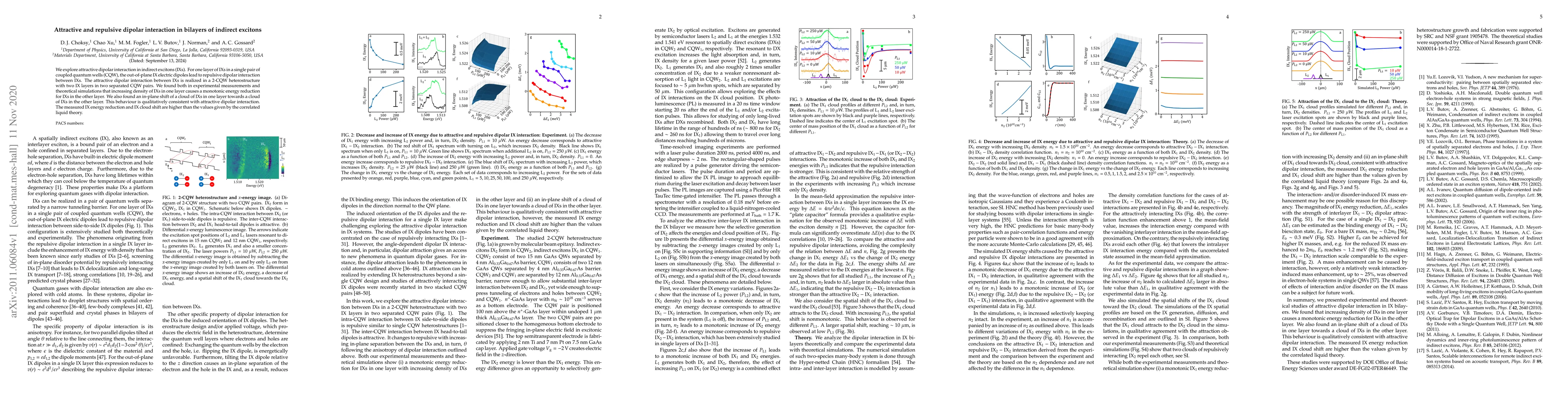 This paper investigates the dipolar interactions in bilayers of indirect excitons (IXs), revealing that while IXs in a single quantum well pair exhibit repulsive dipolar interactions, those in a 2-CQW heterostructure with two separated pairs show attractive dipolar interactions. Experimental and theoretical results indicate that increased IX density in one layer leads to a monotonic energy reduction and an in-plane shift in the other layer, consistent with attractive dipolar interactions, though these effects are stronger than predicted by correlated liquid theory.