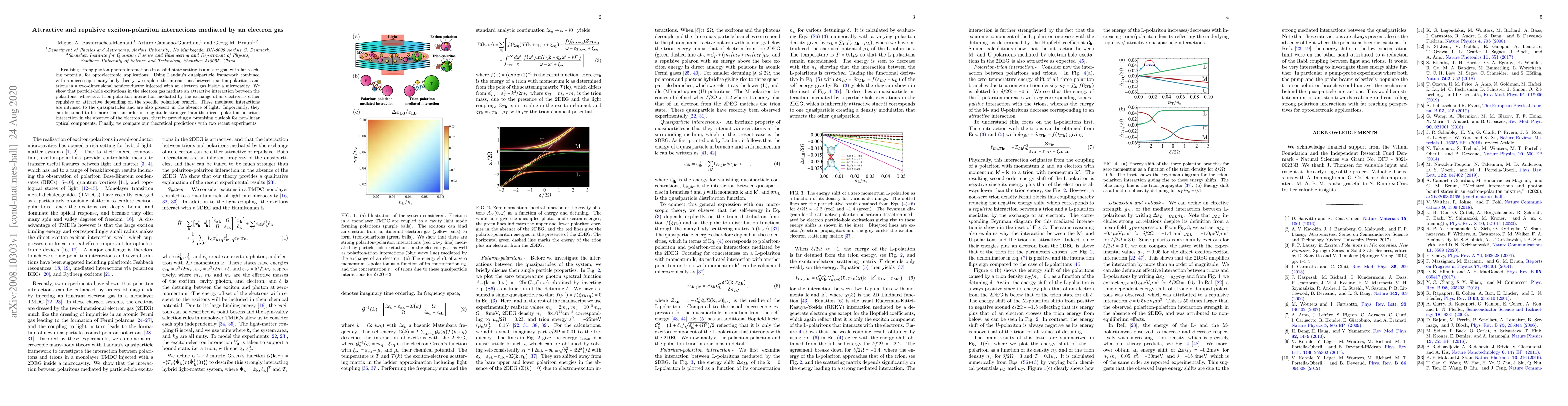 Realising strong photon-photon interactions in a solid-state setting is a major goal with far reaching potential for optoelectronic applications. Using Landau's quasiparticle framework combined with a microscopic many-body theory, we explore the interactions between exciton-polaritons and trions in a two-dimensional semiconductor injected with an electron gas inside a microcavity. We show that particle-hole excitations in the electron gas mediate an attractive interaction between the polaritons, whereas a trion-polariton interaction mediated by the exchange of an electron is either repulsive or attractive depending on the specific polariton branch. These mediated interactions are intrinsic to the quasiparticles and are also present in the absence of light. Importantly, they can be tuned to be more than an order of magnitude stronger than the direct polariton-polariton interaction in the absence of the electron gas, thereby providing a promising outlook for non-linear optical components. Finally, we compare our theoretical predictions with two recent experiments.