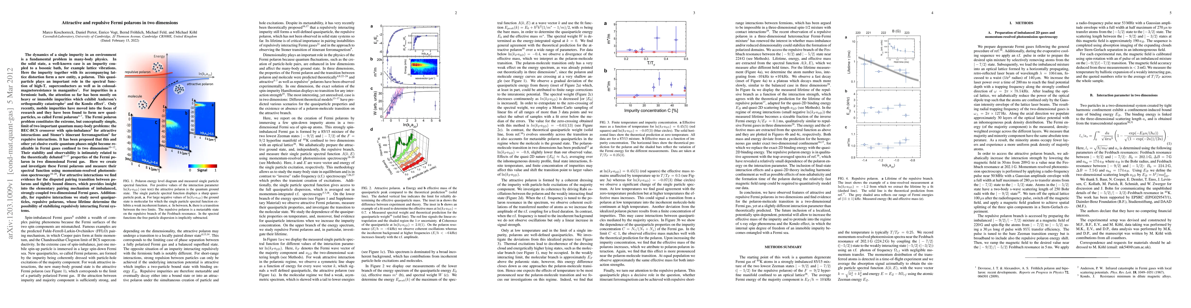 The dynamics of a single impurity in an environment is a fundamental problem in many-body physics. In the solid state, a well-known case is an impurity coupled to a bosonic bath, for example lattice vibrations. Here the impurity together with its accompanying lattice distortion form a new entity, a polaron. This quasiparticle plays an important role in the spectral function of high-Tc superconductors as well as in colossal-magnetoresistance in manganites. For impurities in a fermionic bath, the attention so far has been mostly on heavy or immobile impurities which exhibit Anderson's orthogonality catastrophe and the Kondo effect. Only recently, mobile impurities have moved into the focus of research and they have been found to form new quasiparticles, so called Fermi polarons. The Fermi polaron problem constitutes the extreme, but conceptually simple, limit of two important quantum many-body problems: the BEC-BCS crossover with spin-imbalance for attractive interactions and Stoner's itinerant ferromagnetism for repulsive interactions. It has been proposed that this and other yet elusive exotic quantum phases might become realizable in Fermi gases confined to two dimensions. Their stability and observability is intimately related to the theoretically debated properties of the Fermi polaron in two dimensional Fermi gas. Here we create and investigate these Fermi polarons and measure their spectral function using momentum-resolved photoemission spectroscopy. For attractive interactions we find evidence for the disputed pairing transition between polarons and tightly bound dimers, which provides insight into the elementary pairing mechanism of imbalanced, strongly-coupled two-dimensional Fermi gases. Additionally, for repulsive interactions we study novel quasiparticles, repulsive polarons, whose lifetime determine the possibility of stabilizing repulsively interacting Fermi systems.