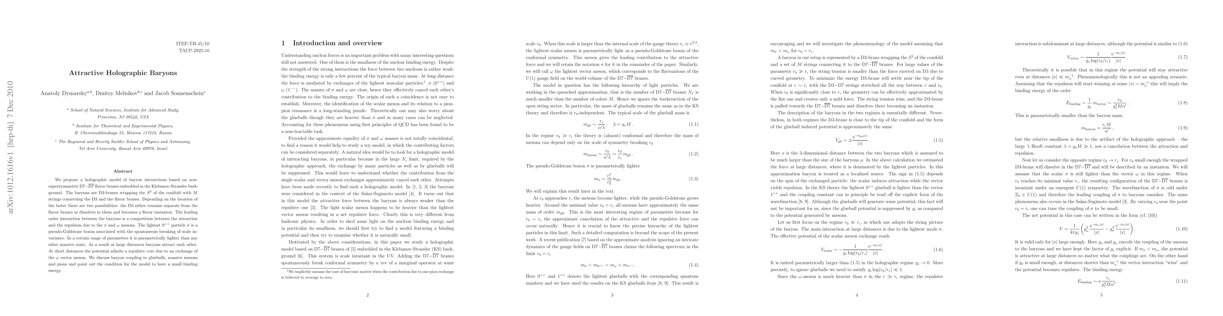 Researchers propose a holographic model of baryon interactions based on D7-branes in a conifold background, suggesting that baryons can attract or repel each other depending on their connection to flavor branes.