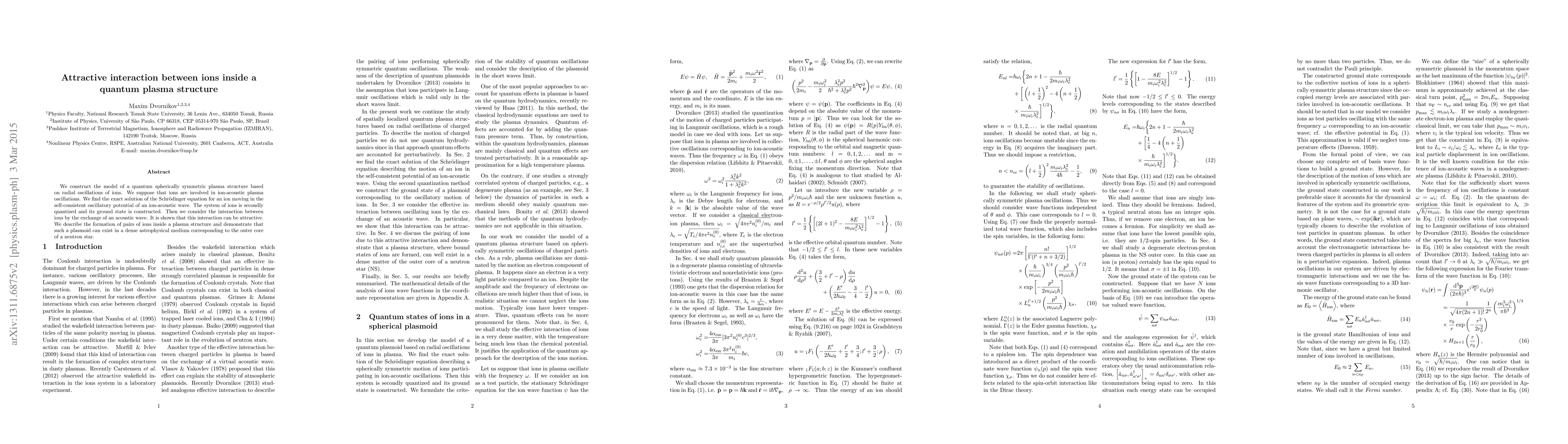 This paper models a quantum plasma structure based on ion-acoustic oscillations, solving the Schrödinger equation for ions in a self-consistent potential, and quantizes the system to show attractive ion-ion interactions via acoustic wave exchange, leading to the formation of ion pairs in dense astrophysical environments like neutron star outer cores.
