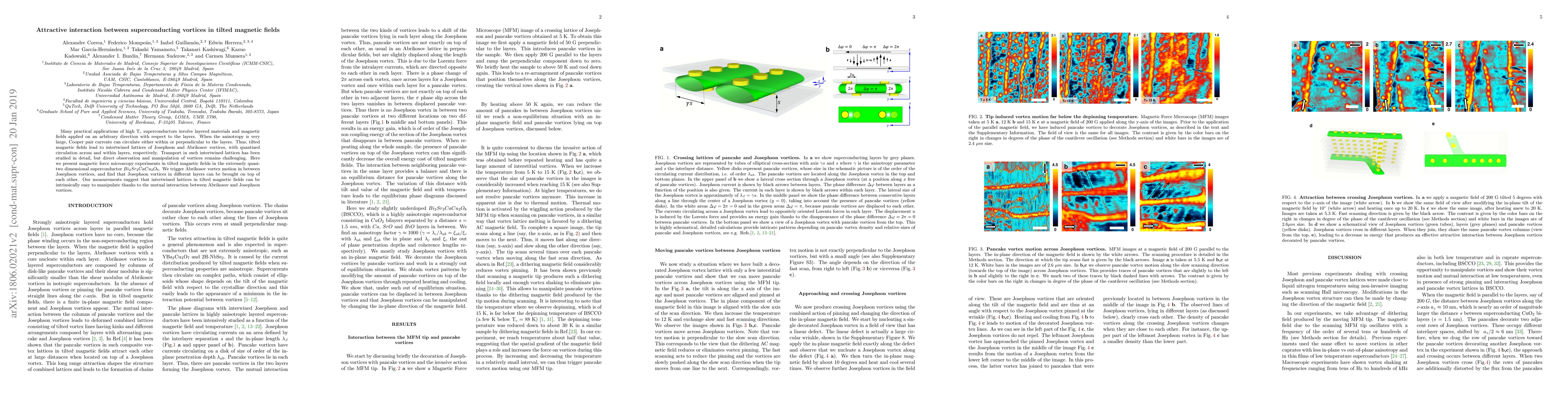 This study explores the attractive interaction between superconducting vortices in tilted magnetic fields using magnetic force microscopy on $Bi_{2}Sr_{2}CaCu_{2}O_{8}$. The research reveals that Josephson and Abrikosov vortices can be manipulated and brought together, suggesting that their mutual interaction facilitates easy manipulation of intertwined vortex lattices.