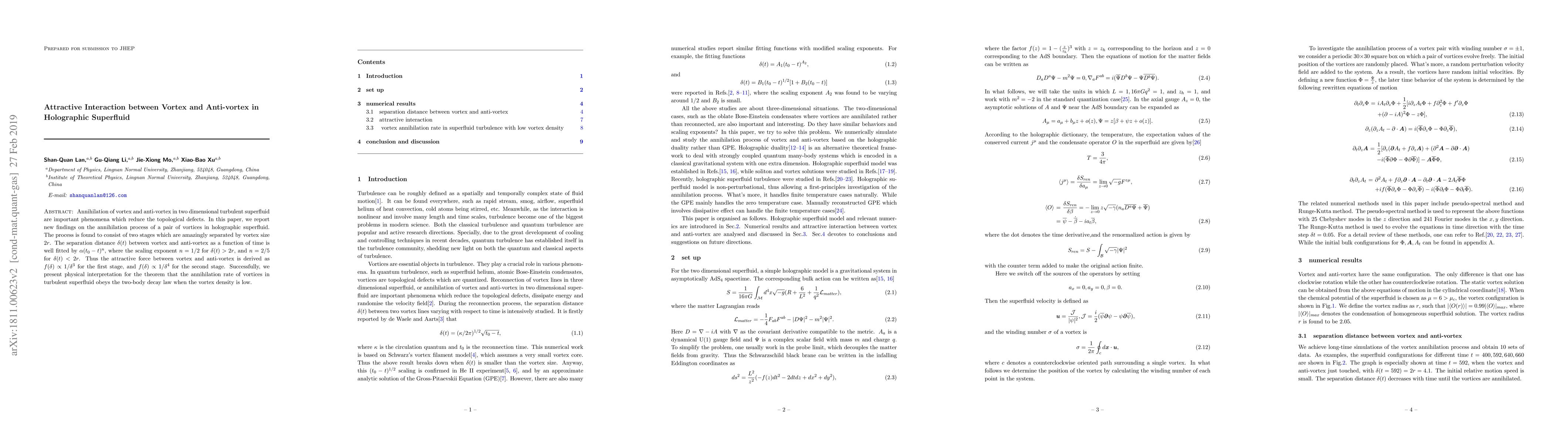 This research numerically simulates the annihilation process of vortex-antivortex pairs in holographic superfluids, revealing two distinct stages of interaction. The attractive force between them is found to scale inversely with the separation distance to the power of 3 in the first stage and 4 in the second, explaining the two-body decay law in low-density turbulent superfluid systems.