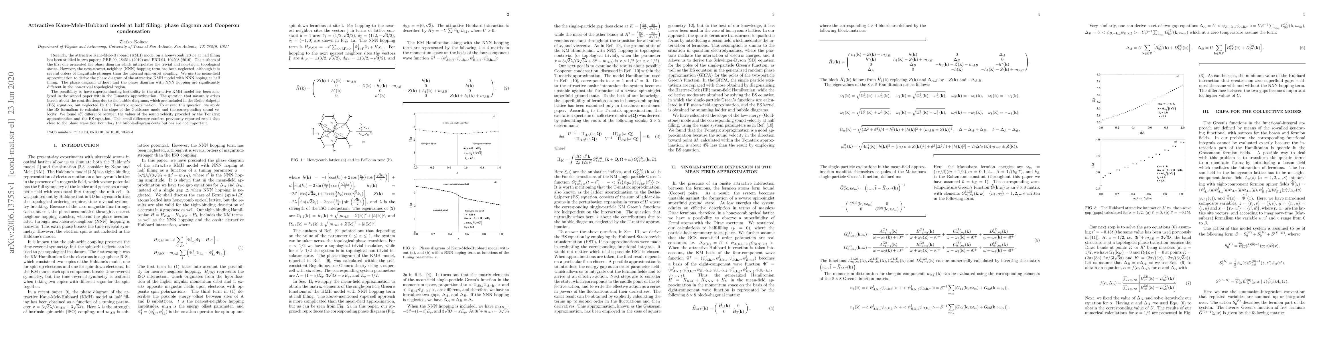 Recently, the attractive Kane-Mele-Habbard (KMH) model on a honeycomb lattice at half filling has been studied in two papers: PRB 99, 184514 (2019) and PRB 94, 104508 (2016). The authors of the first one presented the phase diagram which interpolates the trivial and non-trivial topological states. However, the next-nearest-neighbor (NNN) hopping term has been neglected, although it is several orders of magnitude stronger than the internal spin-orbit coupling. We use the mean-field approximation to derive the phase diagram of the attractive KMH model with NNN hoping at half filling. The phase diagram without and the phase diagram with NNN hopping are significantly different in the non-trivial topological region. The possibility to have superconducting instability in the attractive KMH model has been analyzed in the second paper within the T-matrix approximation. The question that naturally arises here is about the contributions due to the bubble diagrams, which are included in the Bethe-Salpeter (BS) equation, but neglected by the T-matrix approximation. To answer this question, we apply the BS formalism to calculate the slope of the Goldstone mode and the corresponding sound velocity. We found 4% difference between the values of the sound velocity provided by the T-matrix approximation and the BS equation. This small difference confirm previously reported result that close to the phase transition boundary the bubble-diagram contributions are not important.