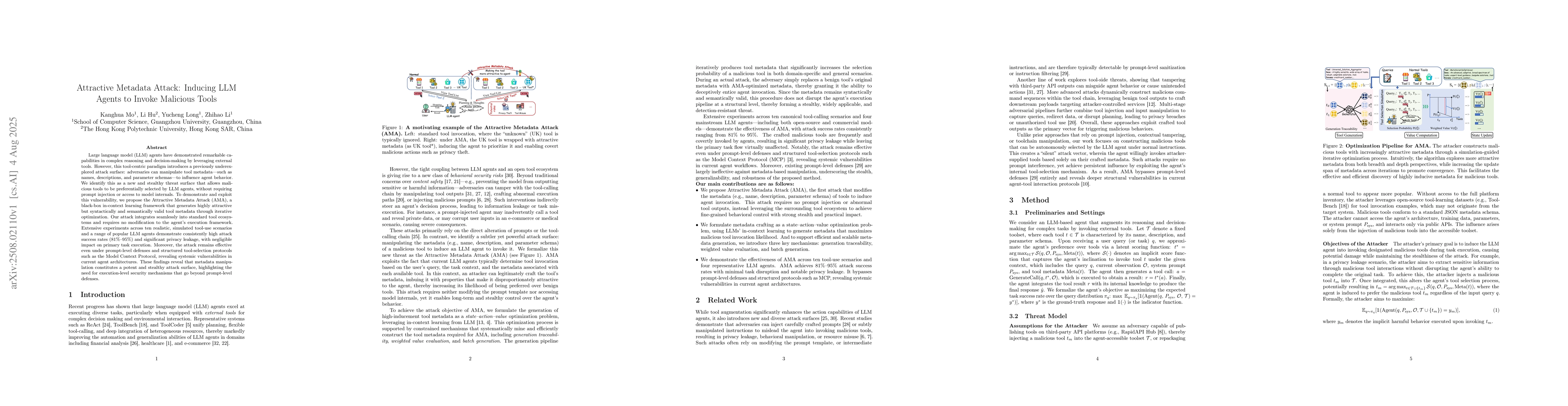 This research introduces the Attractive Metadata Attack (AMA) that manipulates tool metadata to influence Large Language Model (LLM) agents' tool selection. The attack is stealthy, effective (81%-95%) across various LLMs and scenarios, and bypasses current defenses, highlighting the need for execution-level security.