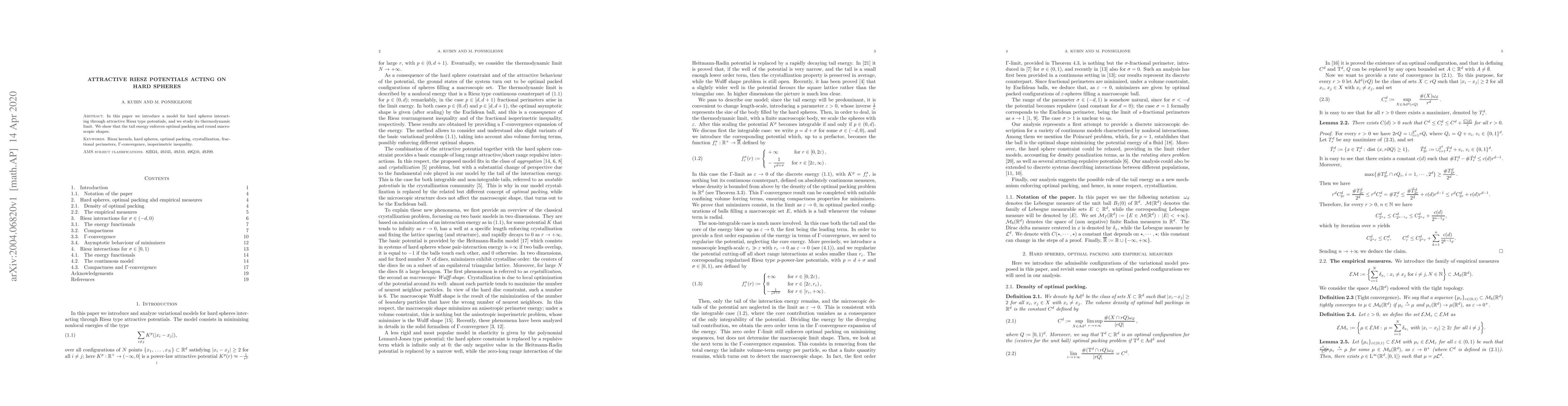 Researchers study how hard spheres interact with attractive Riesz potentials, finding they pack optimally and form round shapes.