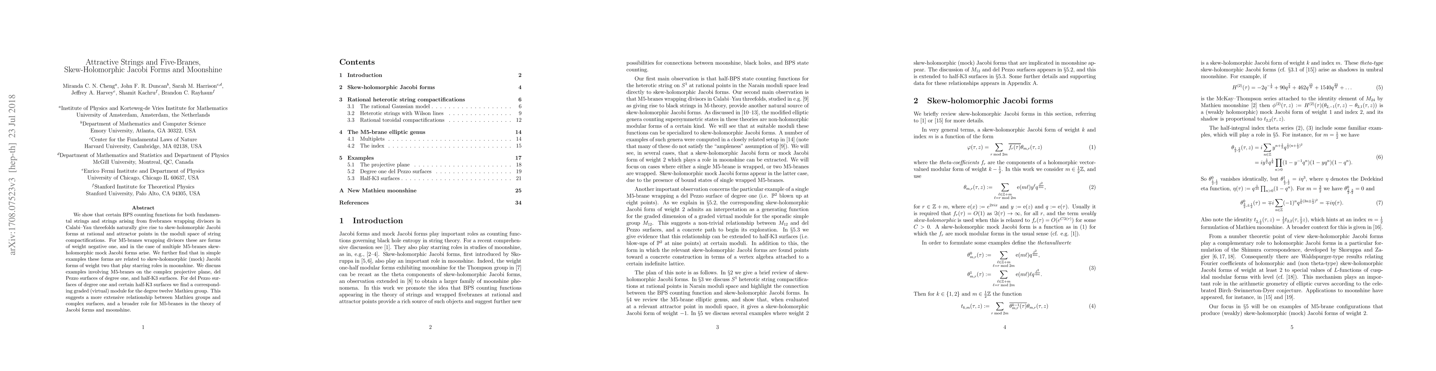 This paper explores how BPS counting functions related to fundamental strings and five-branes in string theory yield skew-holomorphic Jacobi forms, with connections to moonshine phenomena via graded modules for the Mathieu group. The study identifies specific examples involving M5-branes on complex projective planes and del Pezzo surfaces.