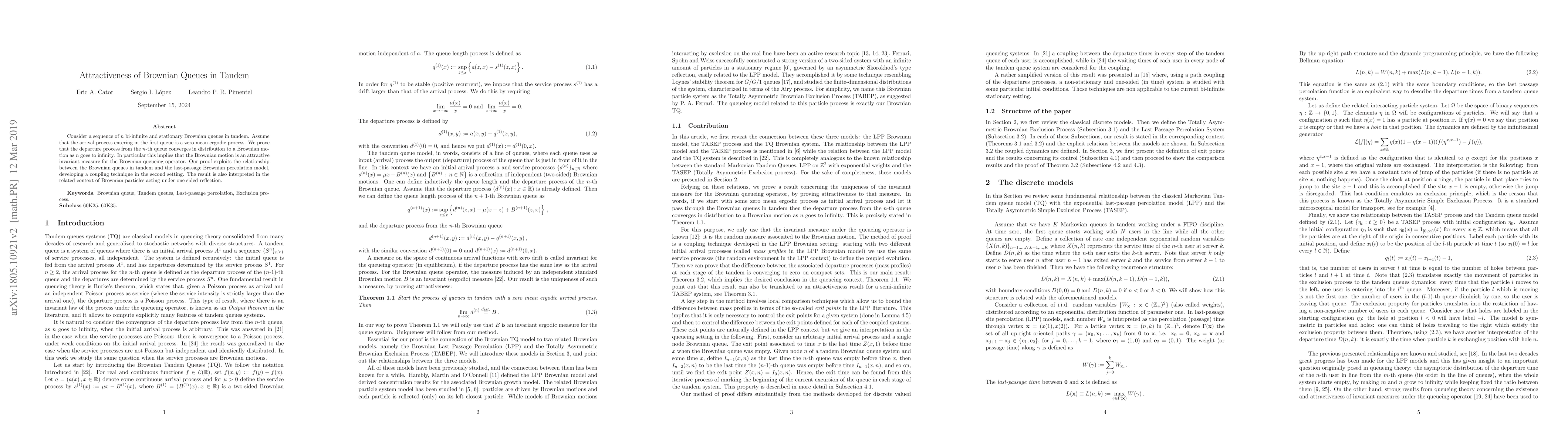 The research utilizes a tandem system of n bi-infinite and stationary Brownian queues, with an ergodic arrival process entering the first queue. It employs a coupling technique between the Brownian queues in tandem and the last-passage Brownian percolation model to prove convergence.