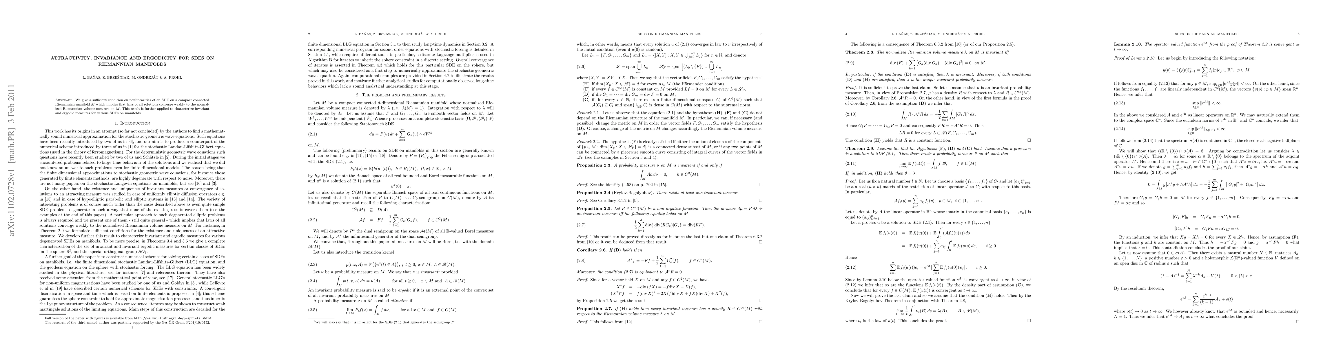 We give a sufficient condition on nonlinearities of an SDE on a compact connected Riemannian manifold $M$ which implies that laws of all solutions converge weakly to the normalized Riemannian volume measure on $M$. This result is further applied to characterize invariant and ergodic measures for various SDEs on manifolds.