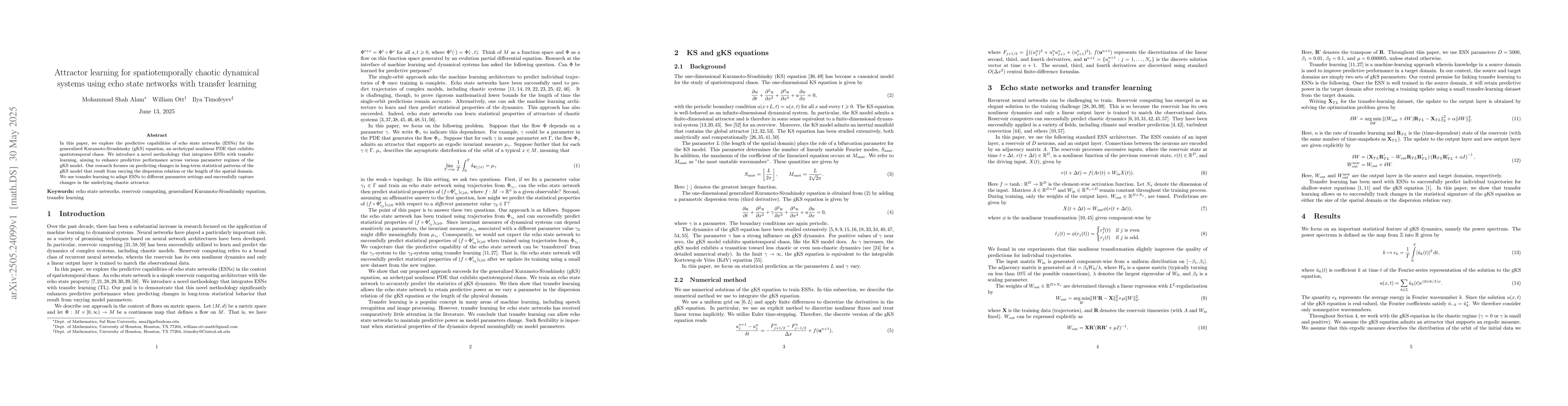 The research employs echo state networks (ESNs) integrated with transfer learning to predict changes in long-term statistical patterns of the generalized Kuramoto-Sivashinsky (gKS) equation, a nonlinear PDE exhibiting spatiotemporal chaos. The method adapts ESNs to different parameter settings via transfer learning to capture variations in chaotic attractors.