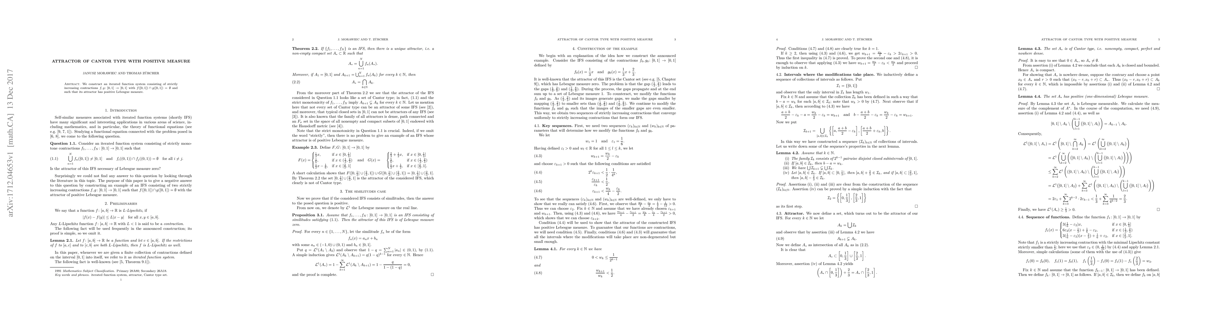 Summary: This paper constructs an iterated function system using strictly increasing contractions on the interval [0,1], where the attractor formed by these contractions has a positive Lebesgue measure, demonstrating a unique Cantor-type set with non-zero measure.