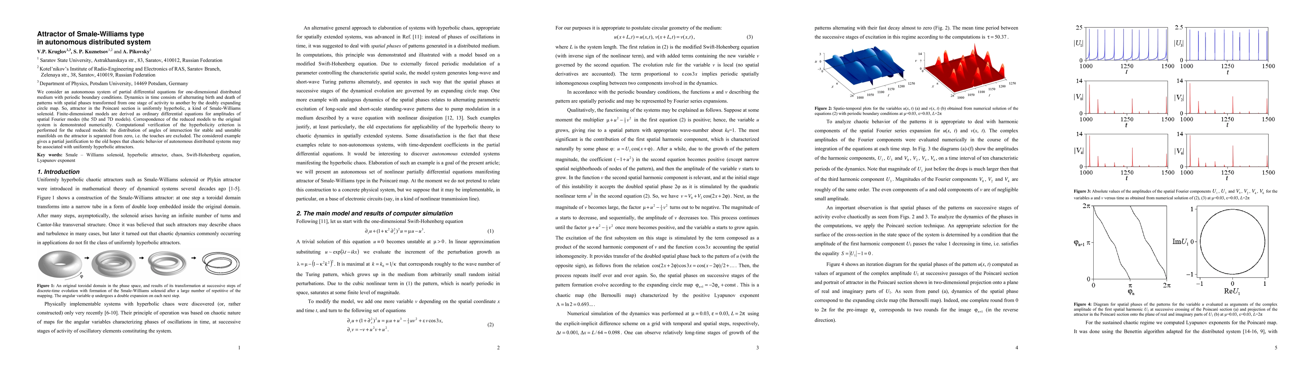 We consider an autonomous system of partial differential equations for one-dimensional distributed medium with periodic boundary conditions. Dynamics in time consists of alternating birth and death of patterns with spatial phases transformed from one stage of activity to another by the doubly expanding circle map. So, attractor in the Poincar\'e section is uniformly hyperbolic, a kind of Smale-Williams solenoid. Finite-dimensional models are derived as ordinary differential equations for amplitudes of spatial Fourier modes (the 5D and 7D models). Correspondence of the reduced models to the original system is demonstrated numerically. Computational verification of the hyperbolicity criterion is performed for the reduced models: the distribution of angles of intersection for stable and unstable manifolds on the attractor is separated from zero, i.e. the touches are excluded. The considered example gives a partial justification to the old hopes that chaotic behavior of autonomous distributed systems may be associated with uniformly hyperbolic attractors.