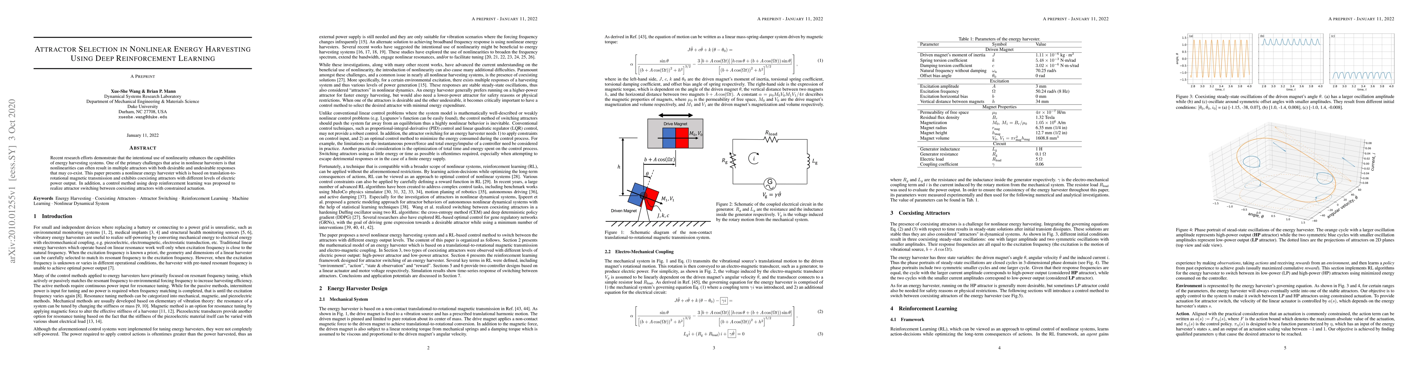 This work is novel in its application of DRL to control nonlinear energy harvesters with coexisting attractors, proposing two distinct control methods and demonstrating successful attractor switching in simulation. The research also introduces a quasi-bang-bang control for smoother actuator motion and investigates RL-learned control policies under different action bounds.