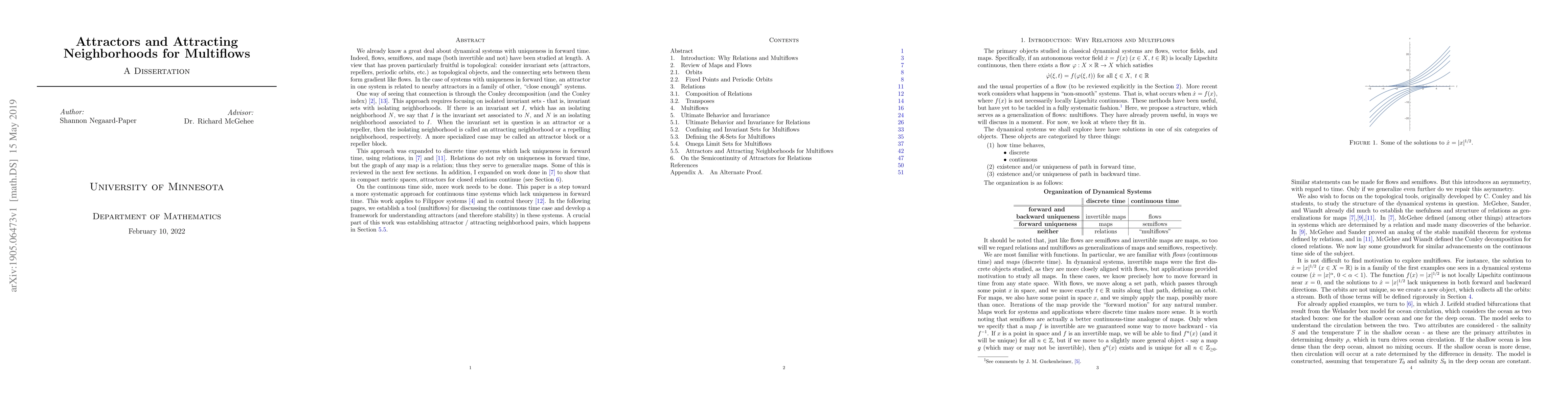 We already know a great deal about dynamical systems with uniqueness in forward time. Indeed, flows, semiflows, and maps (both invertible and not) have been studied at length. A view that has proven particularly fruitful is topological: consider invariant sets (attractors, repellers, periodic orbits, etc.) as topological objects, and the connecting sets between them form gradient like flows. In the case of systems with uniqueness in forward time, an attractor in one system is related to nearby attractors in a family of other, "close enough" systems. One way of seeing that connection is through the Conley decomposition (and the Conley index) [2], [13]. This approach requires focusing on isolated invariant sets - that is, invariant sets with isolating neighborhoods. If there is an invariant set $I$, which has an isolating neighborhood $N$ $\ldots$. This approach was expanded to discrete time systems which lack uniqueness in forward time, using relations, in [7] and [11]. Relations do not rely on uniqueness in forward time, but the graph of any map is a relation; thus they serve to generalize maps. Some of this is reviewed in the next few sections. In addition, I expanded on work done in [7] to show that in compact metric spaces, attractors for closed relations continue (see Section 6). On the continuous time side, more work needs to be done. This paper is a step toward a more systematic approach for continuous time systems which lack uniqueness in forward time. This work applies to Filippov systems [4] and in control theory [12]. In the following pages, we establish a tool (multiflows) for discussing the continuous time case and develop a framework for understanding attractors (and therefore stability) in these systems. A crucial part of this work was establishing attractor / attracting neighborhood pairs, which happens in Section 5.5.