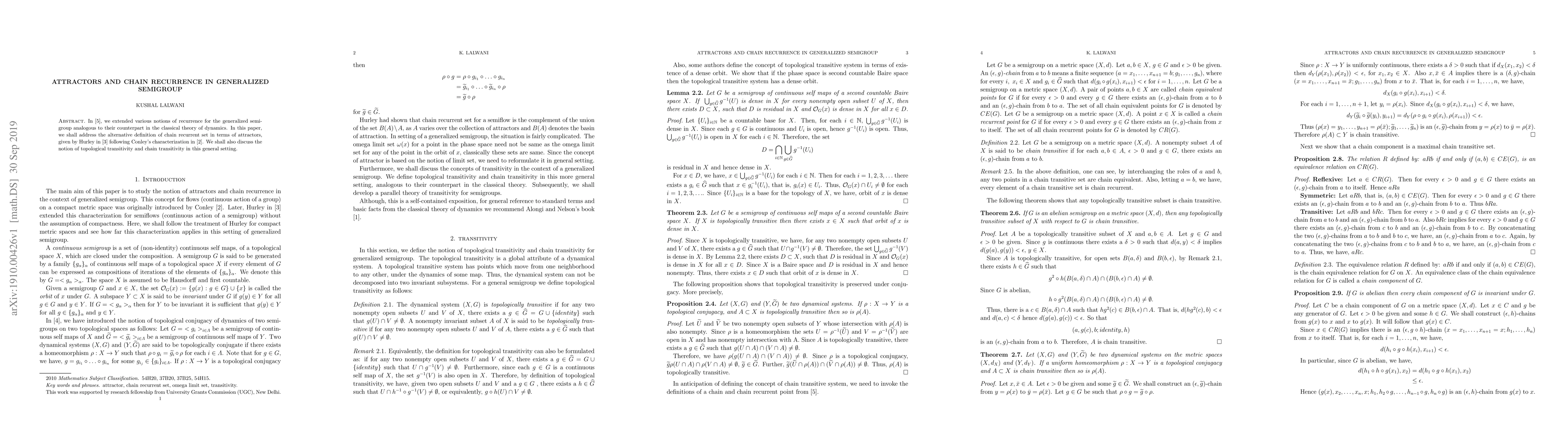 In \cite {kl1}, we extended various notions of recurrence for the generalized semigroup analogous to their counterpart in the classical theory of dynamics. In this paper, we shall address the alternative definition of chain recurrent set in terms of attractors, given by Hurley in \cite {mh} following Conley\rq{}s characterization in \cite {conley}. We shall also discuss the notion of topological transitivity and chain transitivity in this general setting.