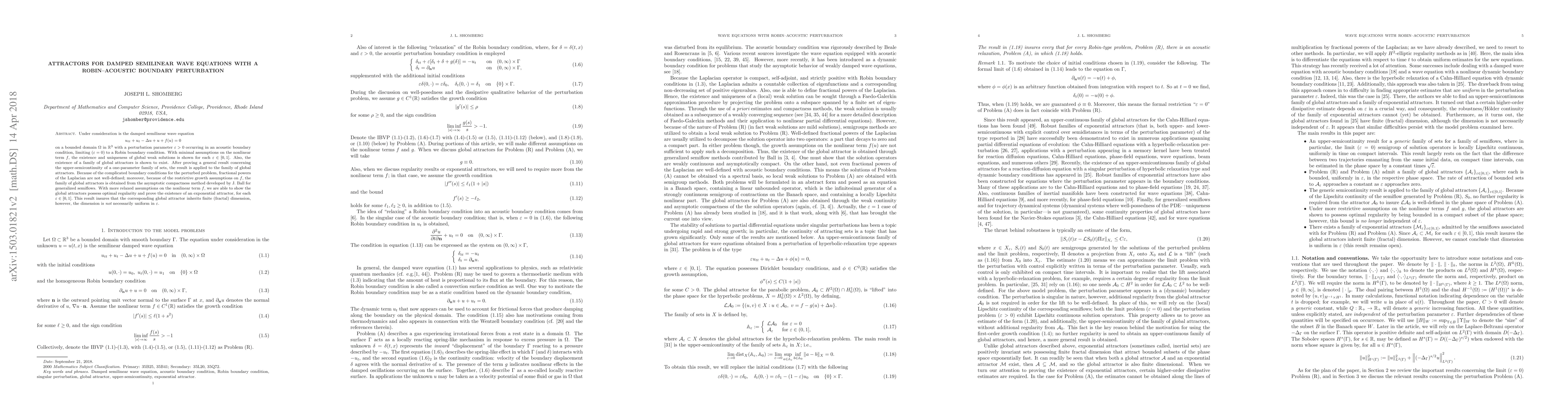Under consideration is the damped semilinear wave equation \[ u_{tt}+u_t-\Delta u + u + f(u)=0 \] on a bounded domain $\Omega$ in $\mathbb{R}^3$ with a perturbation parameter $\varepsilon>0$ occurring in an acoustic boundary condition, limiting ($\varepsilon=0$) to a Robin boundary condition. With minimal assumptions on the nonlinear term $f$, the existence and uniqueness of global weak solutions is shown for each $\varepsilon\in[0,1]$. Also, the existence of a family of global attractors is shown to exist. After proving a general result concerning the upper-semicontinuity of a one-parameter family of sets, the result is applied to the family of global attractors. Because of the complicated boundary conditions for the perturbed problem, fractional powers of the Laplacian are not well-defined; moreover, because of the restrictive growth assumptions on $f$, the family of global attractors is obtained from the asymptotic compactness method developed by J. Ball for generalized semiflows. With more relaxed assumptions on the nonlinear term $f$, we are able to show the global attractors possess optimal regularity and prove the existence of an exponential attractor, for each $\varepsilon\in[0,1].$ This result insures that the corresponding global attractor inherits finite (fractal) dimension, however, the dimension is {\em{not}} necessarily uniform in $\varepsilon$.