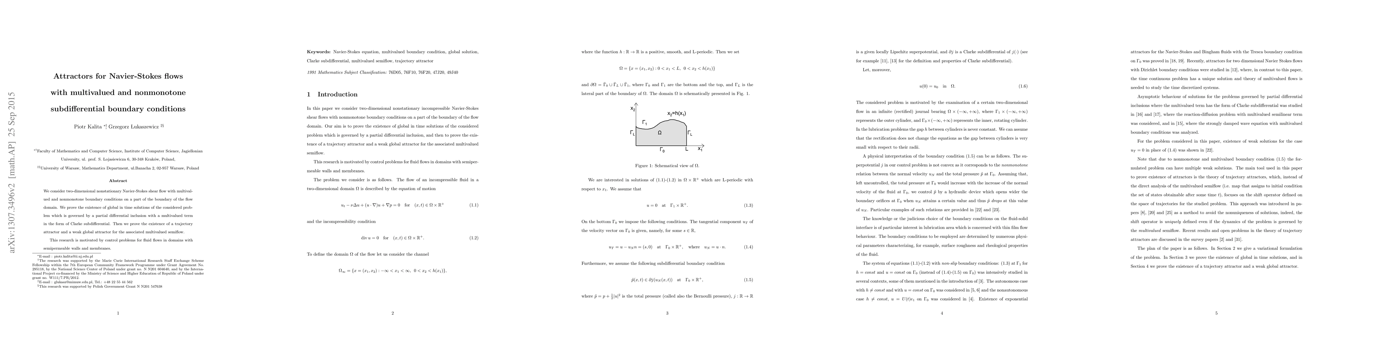 We consider two-dimensional nonstationary Navier-Stokes shear flow with multivalued and nonmonotone boundary conditions on a part of the boundary of the flow domain. We prove the existence of global in time solutions of the considered problem which is governed by a partial differential inclusion with a multivalued term in the form of Clarke subdifferential. Then we prove the existence of a trajectory attractor and a weak global attractor for the associated multivalued semiflow. This research is motivated by control problems for fluid flows in domains with semipermeable walls and membranes.