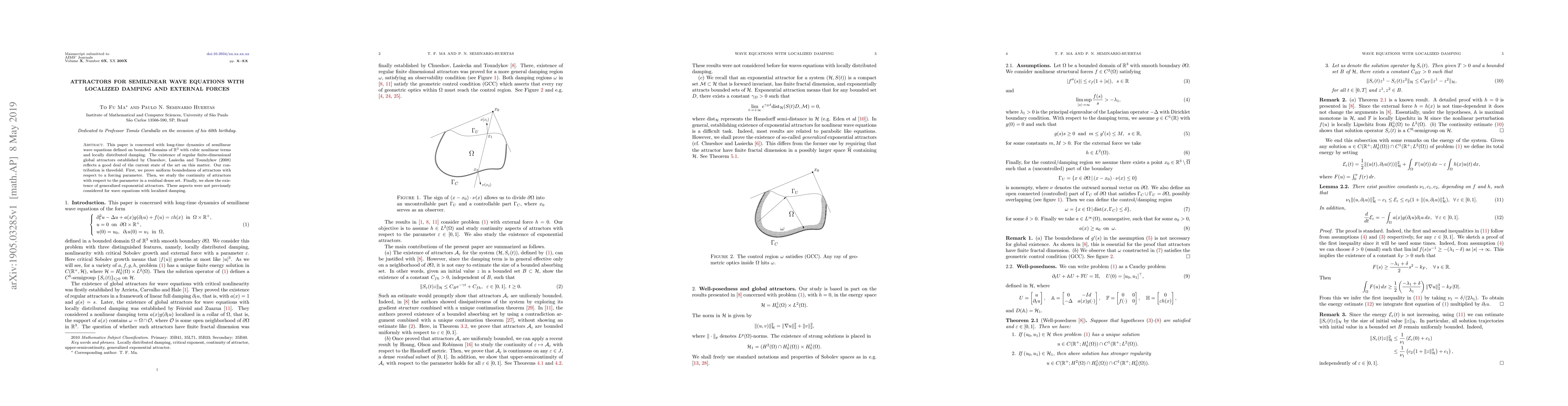 This paper investigates the long-term dynamics of semilinear wave equations featuring cubic nonlinearities, localized damping, and external forces. It proves uniform boundedness of attractors under forcing parameters, examines continuity of attractors in a dense residual set, and establishes the existence of generalized exponential attractors, aspects not previously studied for such wave equations.