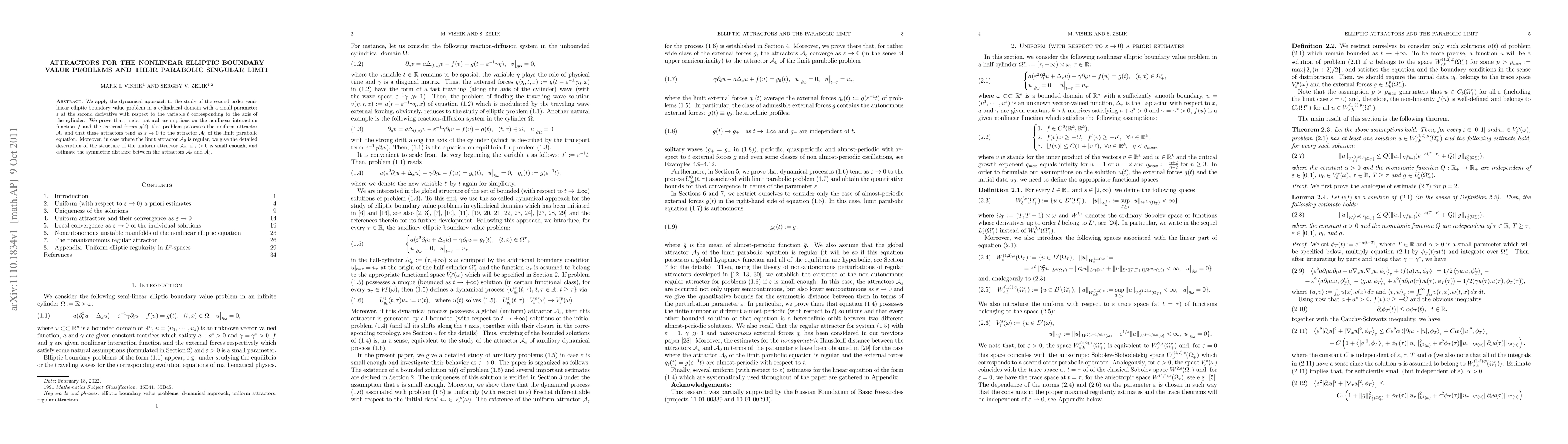 We apply the dynamical approach to the study of the second order semi-linear elliptic boundary value problem in a cylindrical domain with a small parameter at the second derivative with respect to the "time" variable corresponding to the axis of the cylinder. We prove that, under natural assumptions on the nonlinear interaction function and the external forces, this problem possesses the uniform attractors and that these attractors tend to the attractor of the limit parabolic equation. Moreover, in case where the limit attractor is regular, we give the detailed description of the structure of these uniform attractors when the perturbation parameter is small enough, and estimate the symmetric distance between the perturbed and non-perturbed attractors.