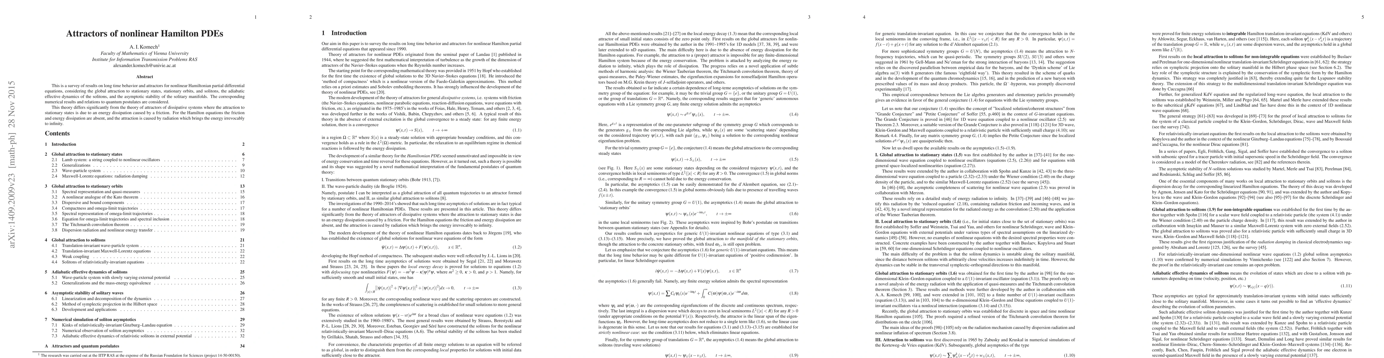 This is a survey of results on long time behavior and attractors for nonlinear Hamiltonian partial differential equations, considering the global attraction to stationary states, stationary orbits, and solitons, the adiabatic effective dynamics of the solitons, and the asymptotic stability of the solitary manifolds. The corresponding numerical results and relations to quantum postulates are considered.