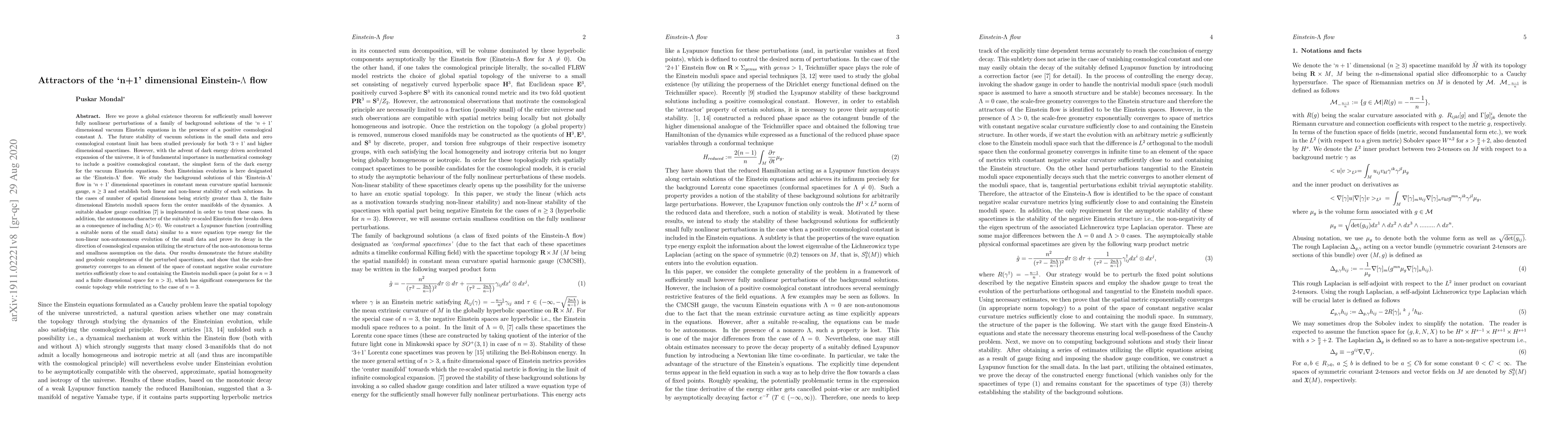 This paper proves global existence and stability for small perturbations of background solutions in the Einstein-$\Lambda$ flow, which models the accelerated expansion of the universe with a positive cosmological constant. The study establishes linear and nonlinear stability in $n+1$ dimensional spacetimes, showing that perturbed spacetimes converge to elements of the Einstein moduli space, with implications for cosmic topology.