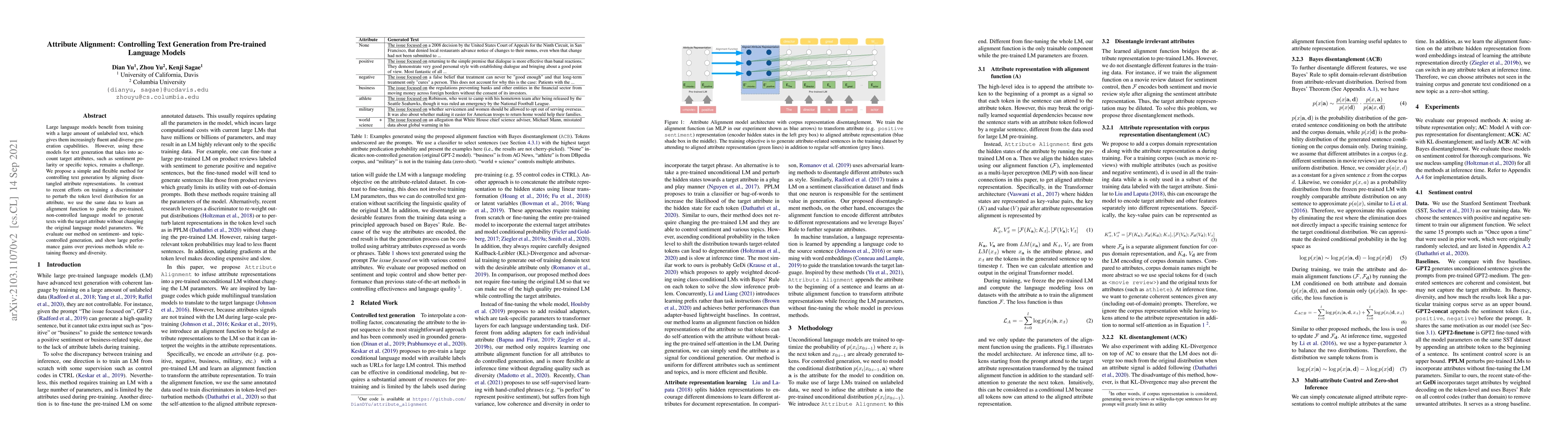 This paper proposes a method to control text generation from pre-trained language models by aligning disentangled attribute representations, enabling generation of texts with specific attributes like sentiment or topics without altering the model parameters. The approach shows significant performance gains over previous methods while maintaining text fluency and diversity.
