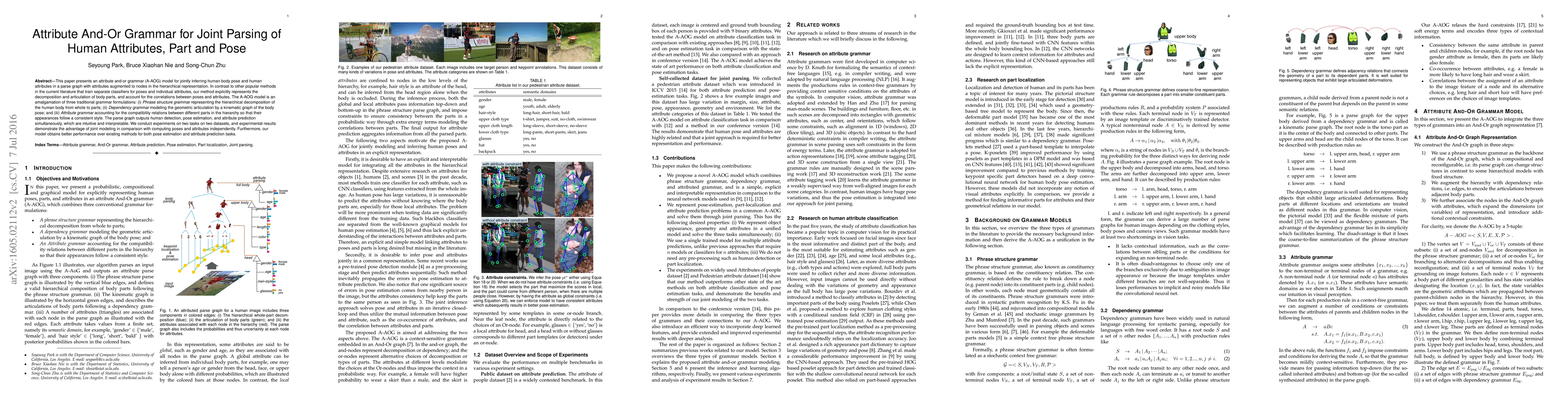 This paper presents an attribute and-or grammar (A-AOG) model for jointly inferring human body pose and human attributes in a parse graph with attributes augmented to nodes in the hierarchical representation. In contrast to other popular methods in the current literature that train separate classifiers for poses and individual attributes, our method explicitly represents the decomposition and articulation of body parts, and account for the correlations between poses and attributes. The A-AOG model is an amalgamation of three traditional grammar formulations: (i) Phrase structure grammar representing the hierarchical decomposition of the human body from whole to parts; (ii) Dependency grammar modeling the geometric articulation by a kinematic graph of the body pose; and (iii) Attribute grammar accounting for the compatibility relations between different parts in the hierarchy so that their appearances follow a consistent style. The parse graph outputs human detection, pose estimation, and attribute prediction simultaneously, which are intuitive and interpretable. We conduct experiments on two tasks on two datasets, and experimental results demonstrate the advantage of joint modeling in comparison with computing poses and attributes independently. Furthermore, our model obtains better performance over existing methods for both pose estimation and attribute prediction tasks.