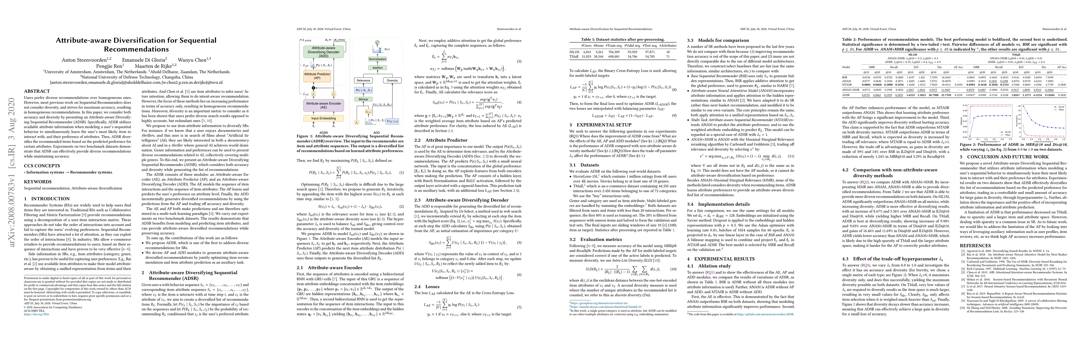 This paper introduces an Attribute-aware Diversifying Sequential Recommender (ADSR) that balances accuracy and diversity by leveraging user attribute information to model sequential behavior. ADSR diversifies recommendations based on predicted attribute preferences, achieving both diverse and accurate recommendations, as shown by experiments on benchmark datasets.