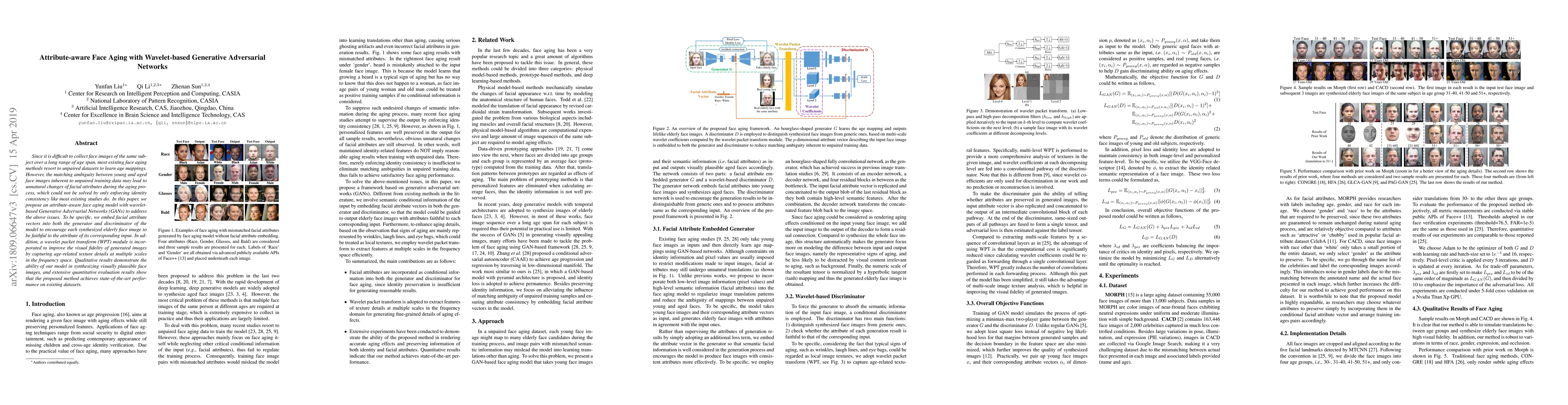 This paper proposes an attribute-aware face aging model using wavelet-based GANs that embeds facial attribute vectors to ensure generated aged faces maintain corresponding attributes. A wavelet packet transform module enhances visual fidelity by capturing age-related details, achieving state-of-the-art performance on aging datasets.