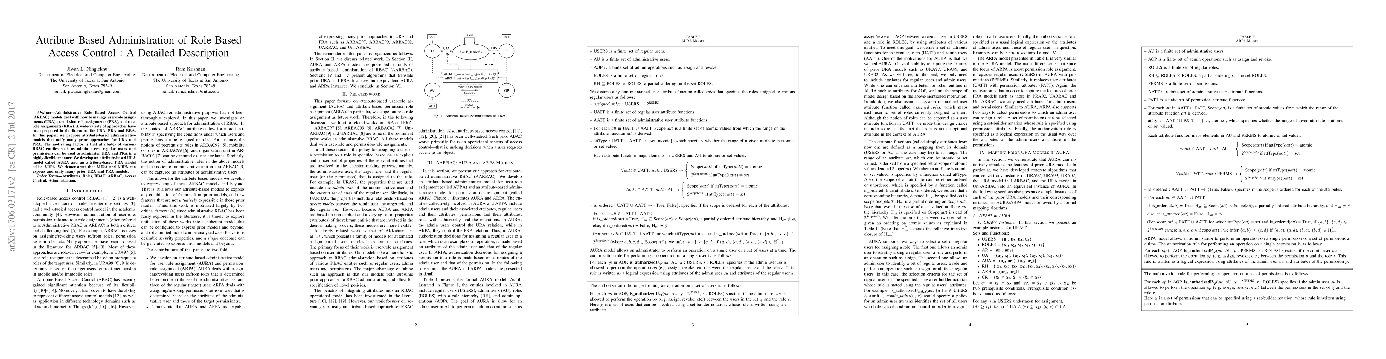 This paper proposes attribute-based administrative models for Role Based Access Control (RBAC) to manage user-role and permission-role assignments more flexibly. It introduces AURA and ARPA models that unify various prior approaches by leveraging attributes of RBAC entities.