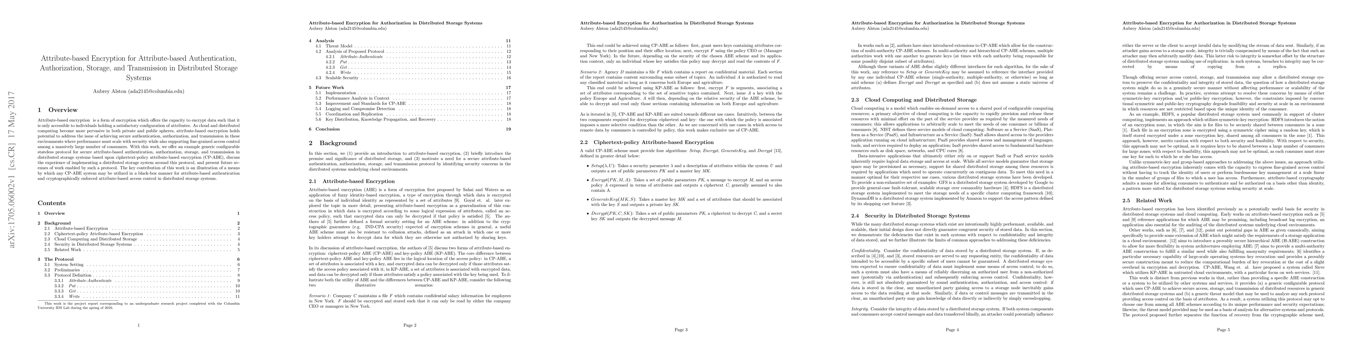 Attribute-based encryption is a form of encryption which offers the capacity to encrypt data such that it is only accessible to individuals holding a satisfactory configuration of attributes. As cloud and distributed computing become more pervasive in both private and public spheres, attribute-based encryption holds potential to address the issue of achieving secure authentication, authorization, and transmission in these environments where performance must scale with security while also supporting fine-grained access control among a massively large number of consumers. With this work, we offer an example generic configurable stateless protocol for secure attribute-based authentication, authorization, storage, and transmission in distributed storage systems based upon ciphertext-policy attribute-based encryption (CP-ABE), discuss the experience of implementing a distributed storage system around this protocol, and present future avenues of work enabled by such a protocol. The key contribution of this work is an illustration of a means by which any CP-ABE system may be utilized in a black-box manner for attribute-based authentication and cryptographically enforced attribute-based access control in distributed storage systems.