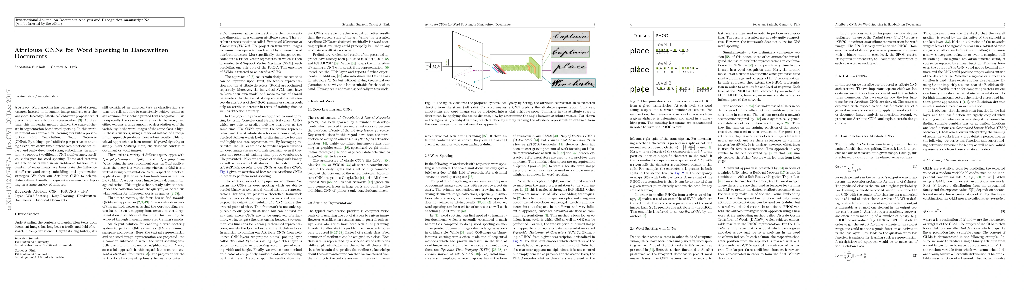 This paper proposes Attribute CNNs for segmentation-based word spotting in handwritten documents, introducing two loss functions and specialized CNN architectures that achieve state-of-the-art results across multiple datasets. The approach leverages probabilistic training and end-to-end learning for optimal performance.