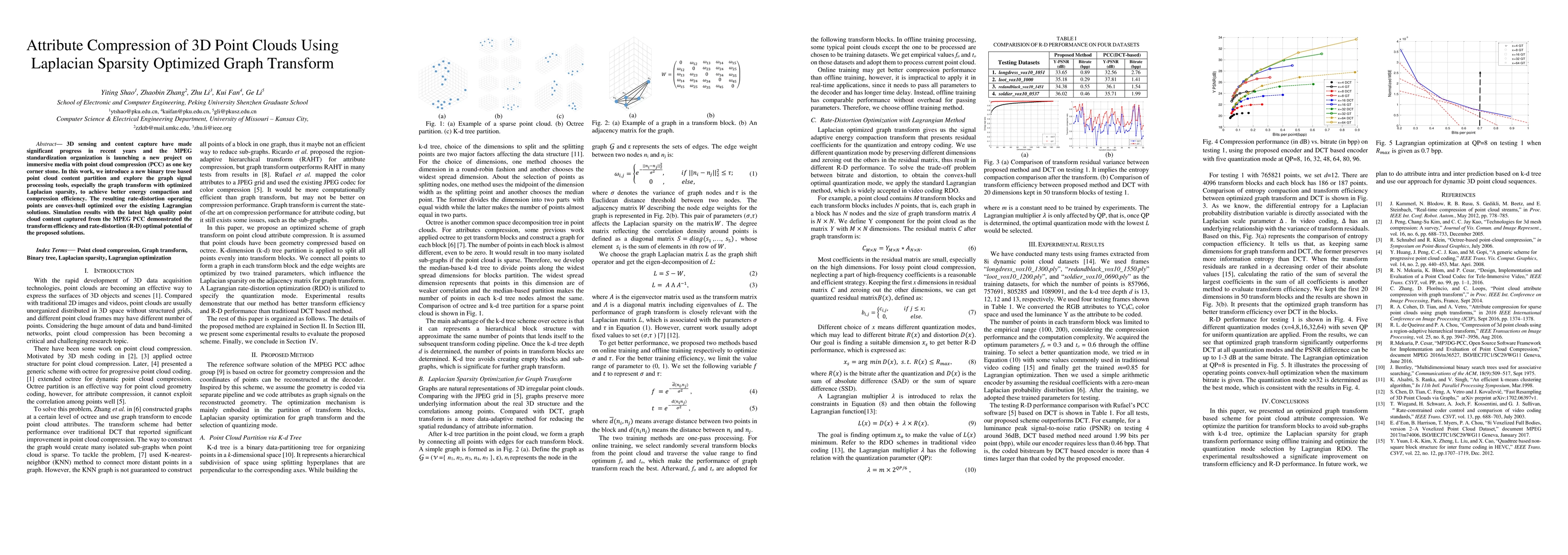 3D sensing and content capture have made significant progress in recent years and the MPEG standardization organization is launching a new project on immersive media with point cloud compression (PCC) as one key corner stone. In this work, we introduce a new binary tree based point cloud content partition and explore the graph signal processing tools, especially the graph transform with optimized Laplacian sparsity, to achieve better energy compaction and compression efficiency. The resulting rate-distortion operating points are convex-hull optimized over the existing Lagrangian solutions. Simulation results with the latest high quality point cloud content captured from the MPEG PCC demonstrated the transform efficiency and rate-distortion (R-D) optimal potential of the proposed solutions.
