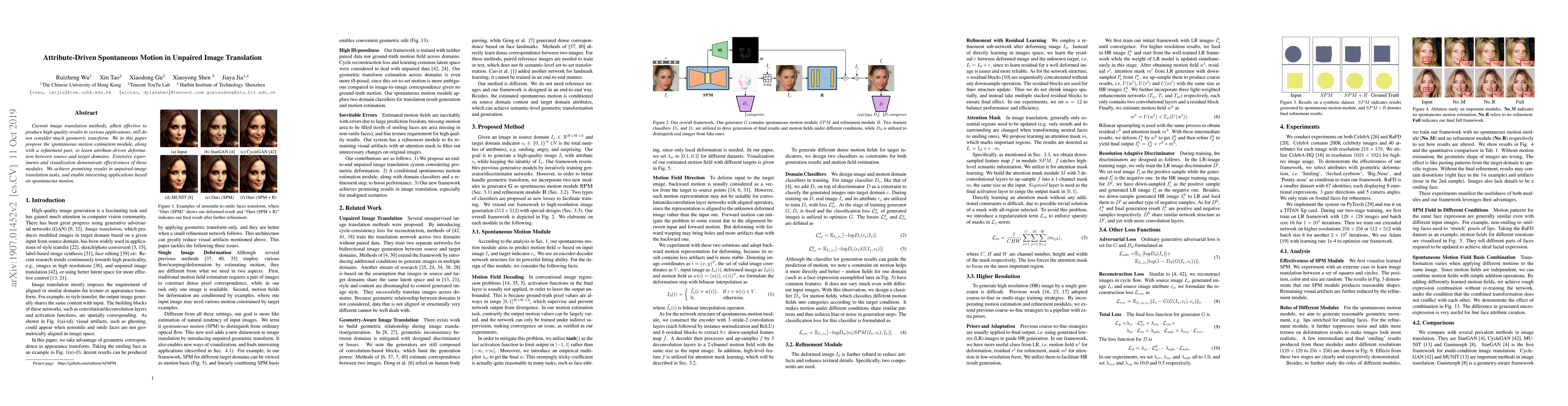 Current image translation methods, albeit effective to produce high-quality results in various applications, still do not consider much geometric transform. We in this paper propose the spontaneous motion estimation module, along with a refinement part, to learn attribute-driven deformation between source and target domains. Extensive experiments and visualization demonstrate effectiveness of these modules. We achieve promising results in unpaired-image translation tasks, and enable interesting applications based on spontaneous motion.
