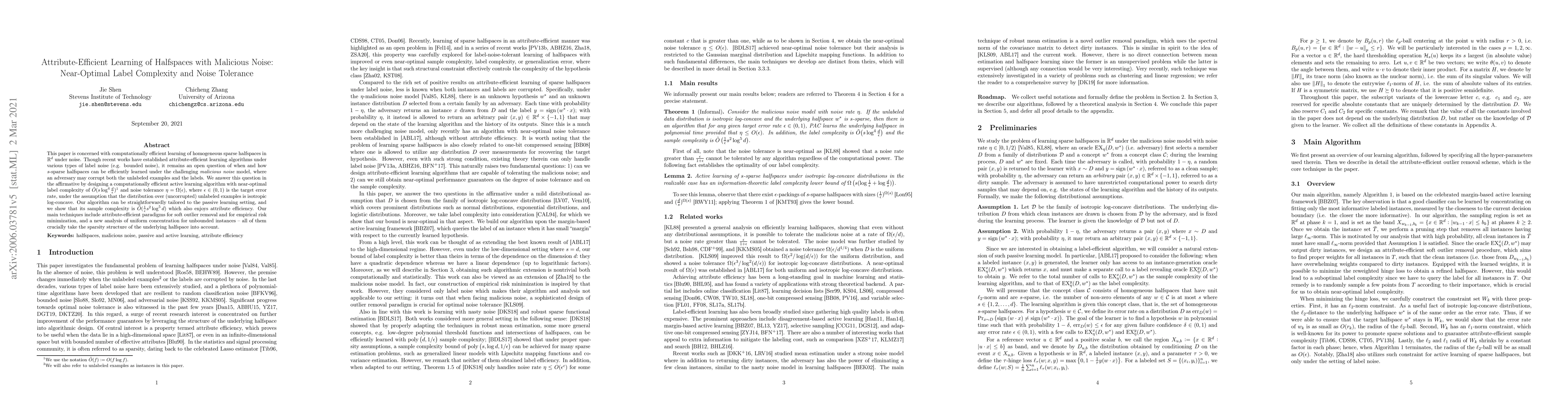 This paper presents an efficient active learning algorithm for learning sparse halfspaces under malicious noise, achieving near-optimal label complexity and noise tolerance. The algorithm leverages attribute-efficient instance reweighting and empirical risk minimization techniques, with a sample complexity of $\tilde{O}\big({\frac 1 \epsilon s^2 \log^5 d} \big)$ in the passive setting.